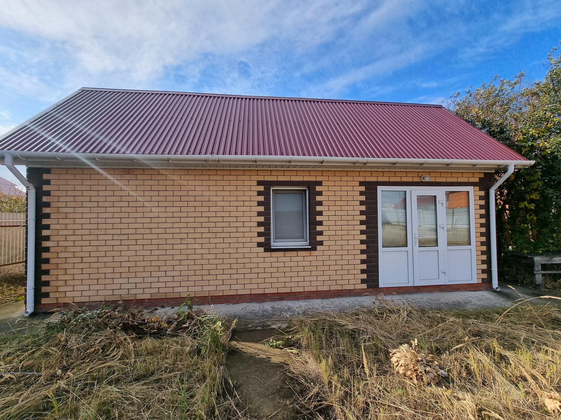 Кровля дома выполнена из проф. листа, современного цвета -шоколад.