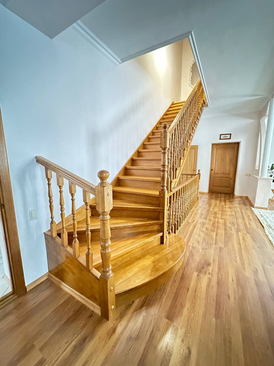 Натяжные потолки, пол - ламинат ,плитка , деревянные межкомнатные двери , дубовая лестница по всему дому.