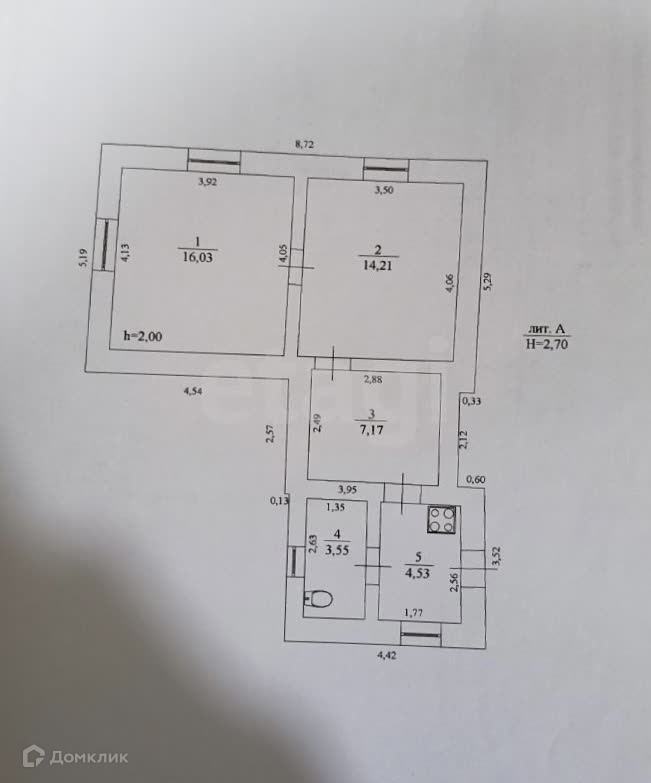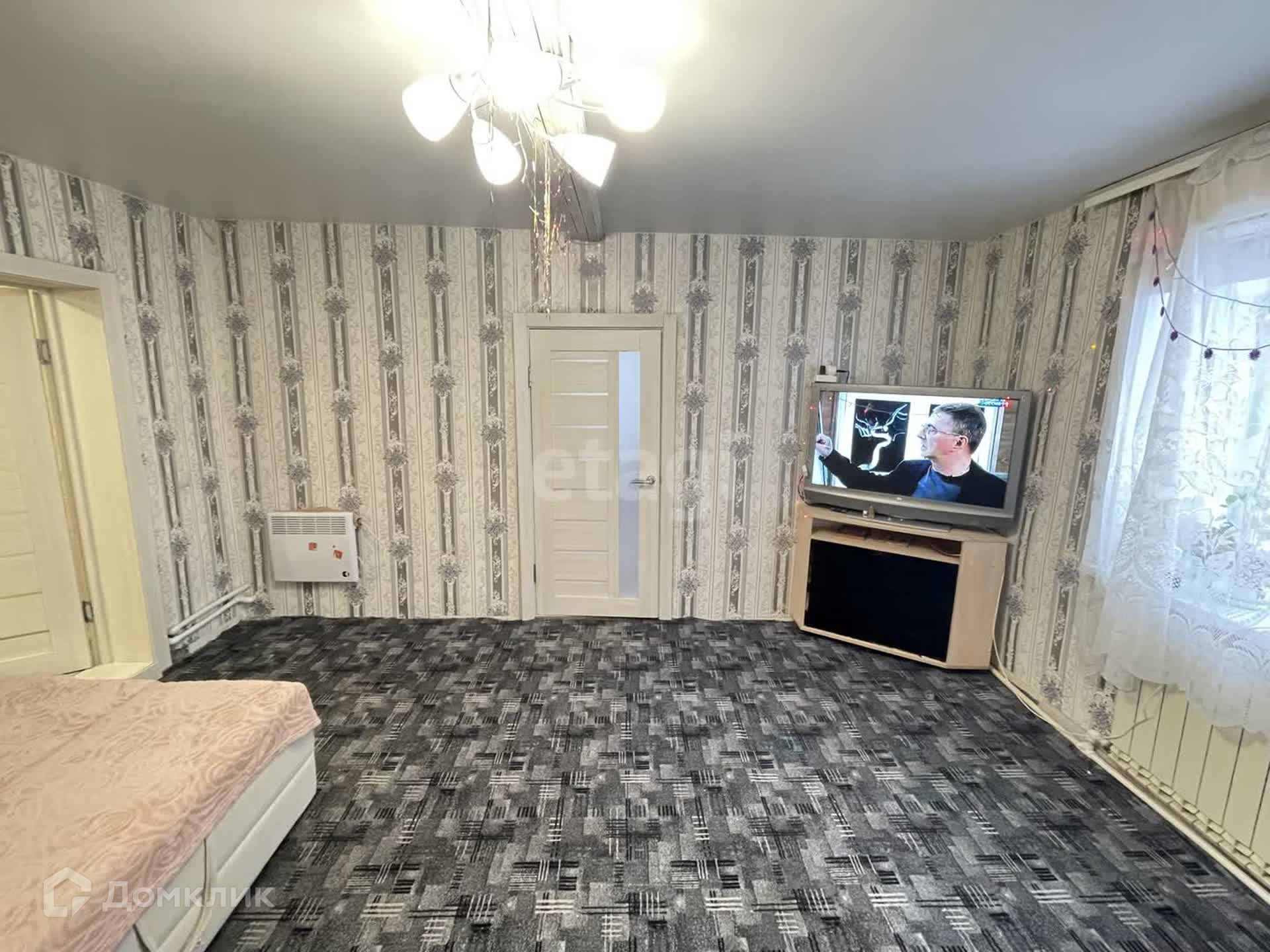 На первом этаже две комнаты (14 и 16 метров), кухня 7 метров, санузел 3.55м. Все окна пластиковые, на полу застелен ковролин.