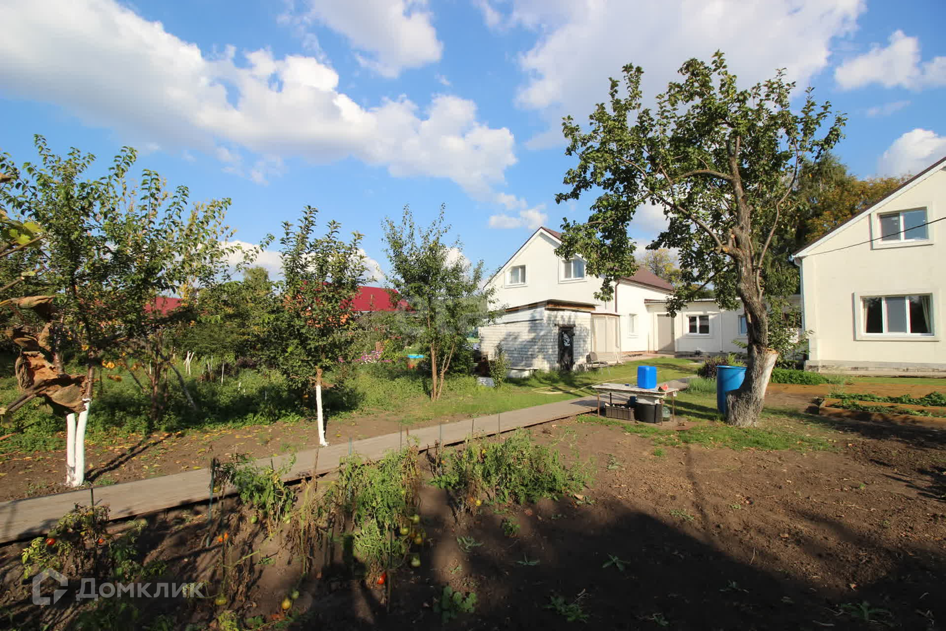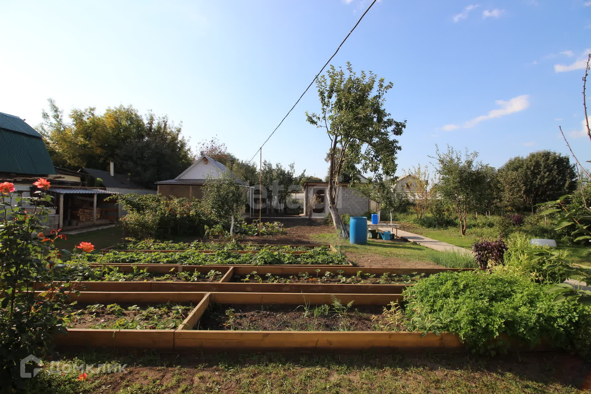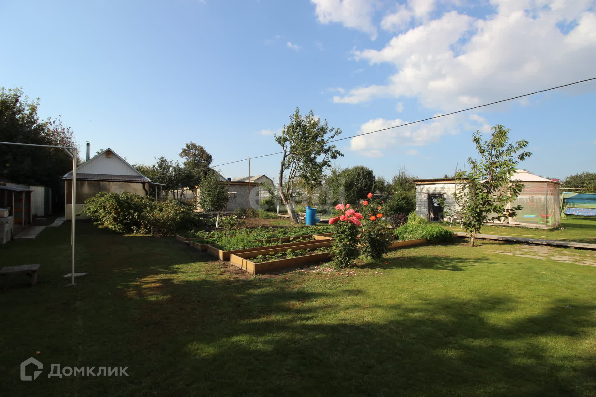 Приятный задний двор с беседкой, баней и сараем.