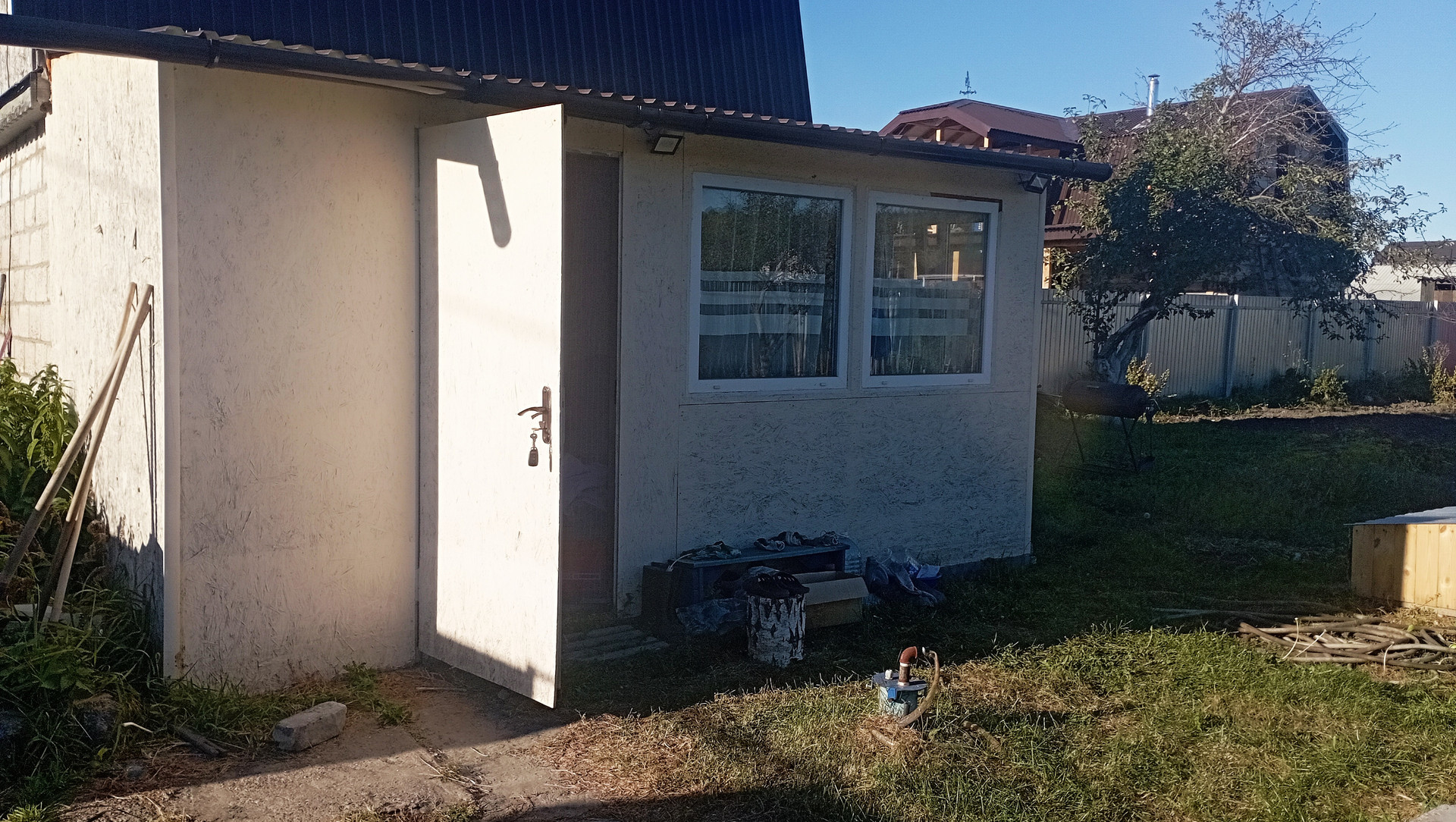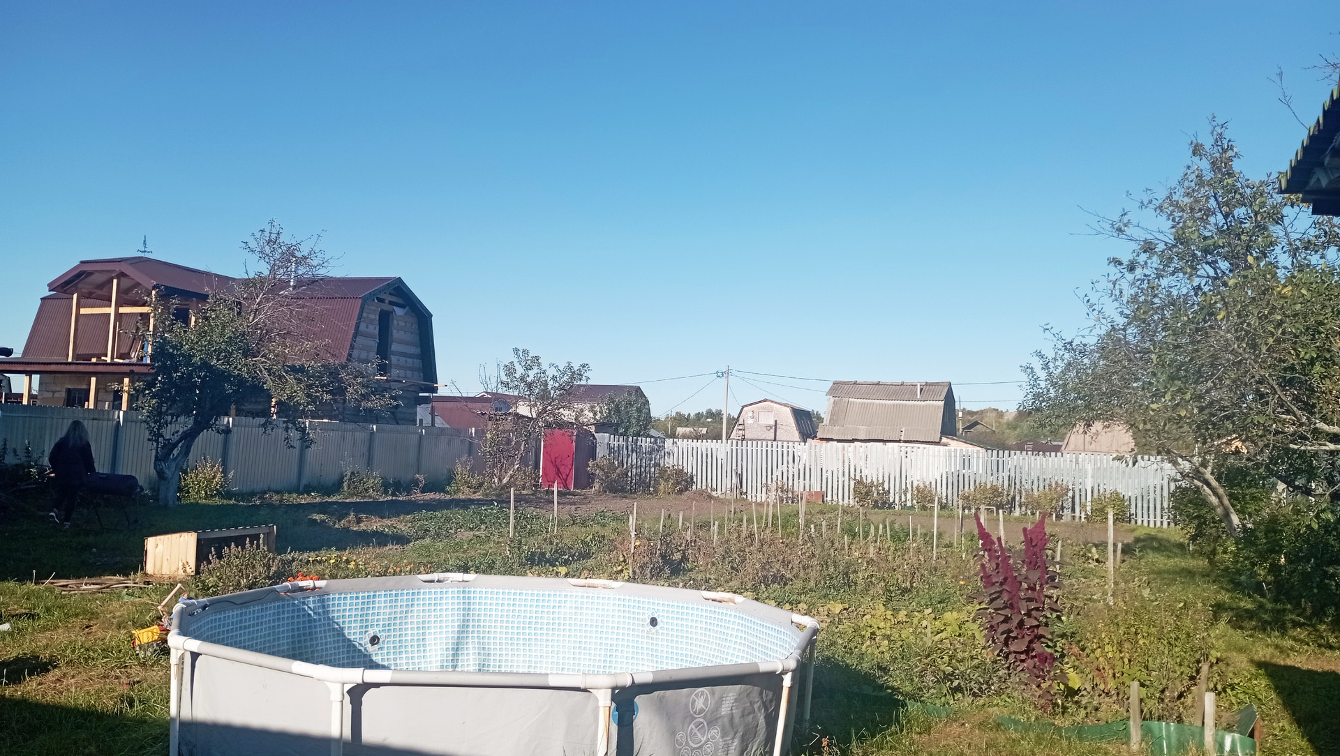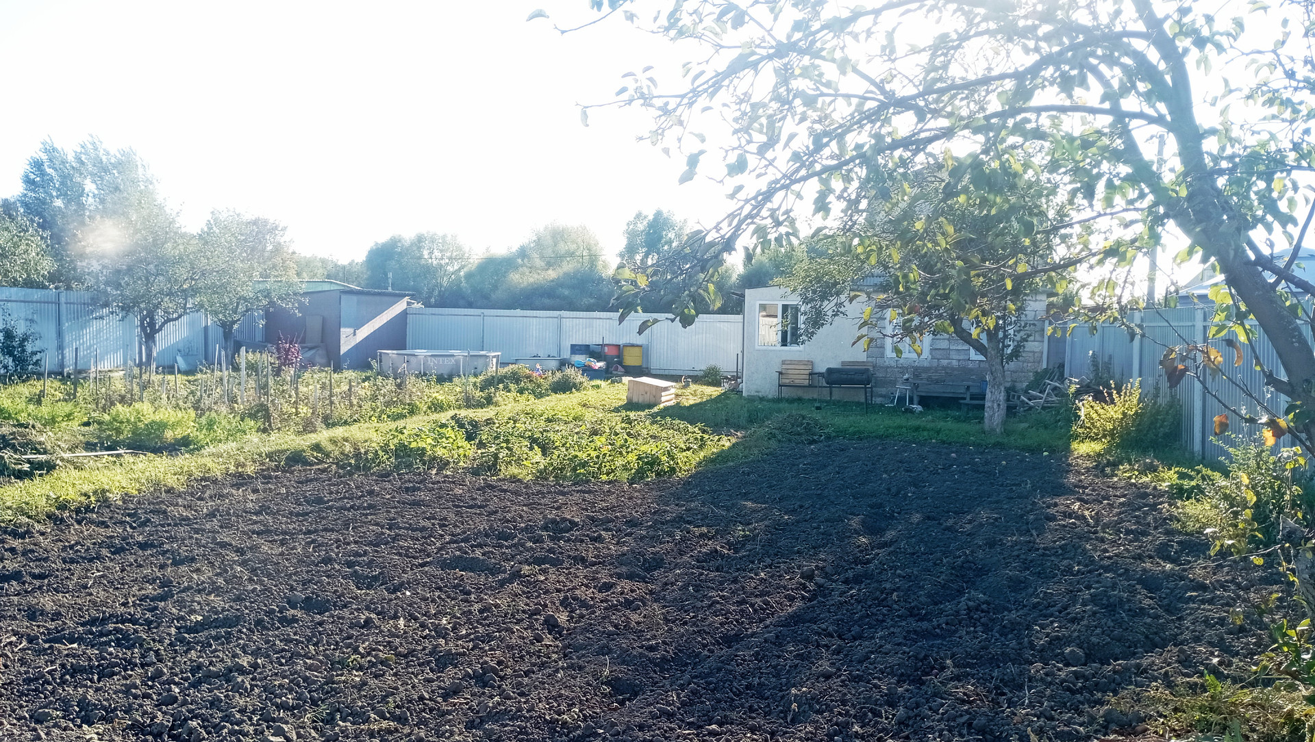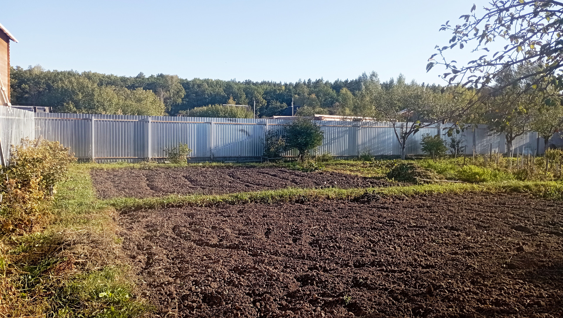 Участок огорожен профлистом, имеется две скважины, колодец, сарай, туалет, подключено электричество. На участке есть яблоня, слива, ирга, жимолость, черная смородина, клубника.