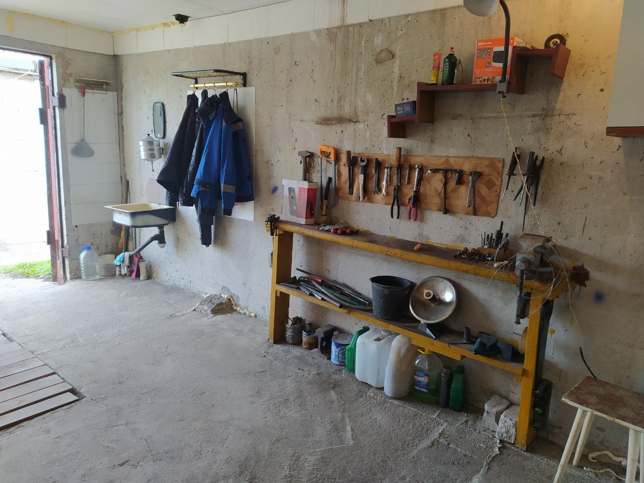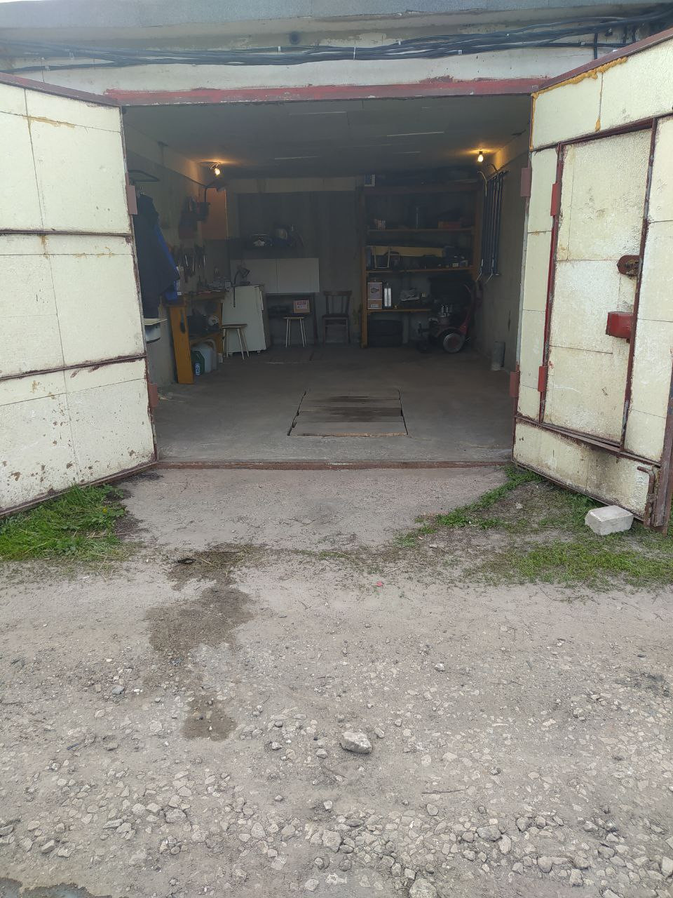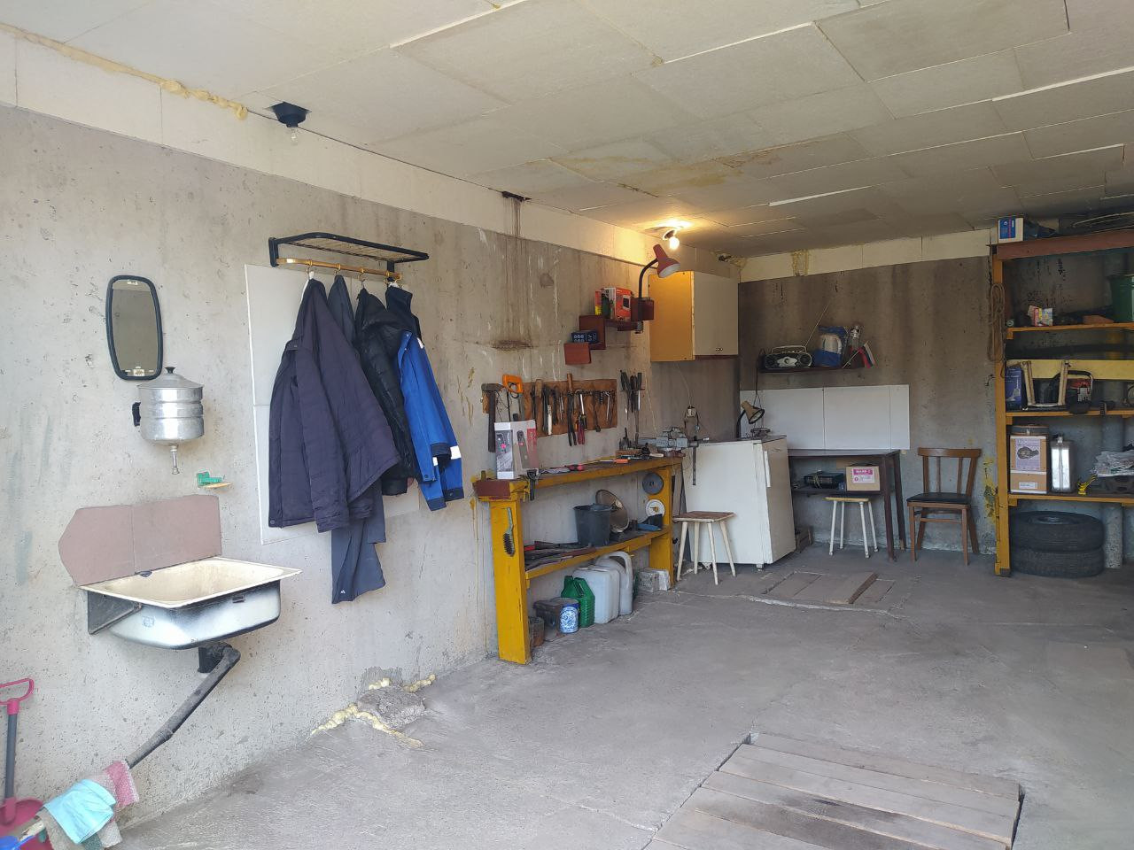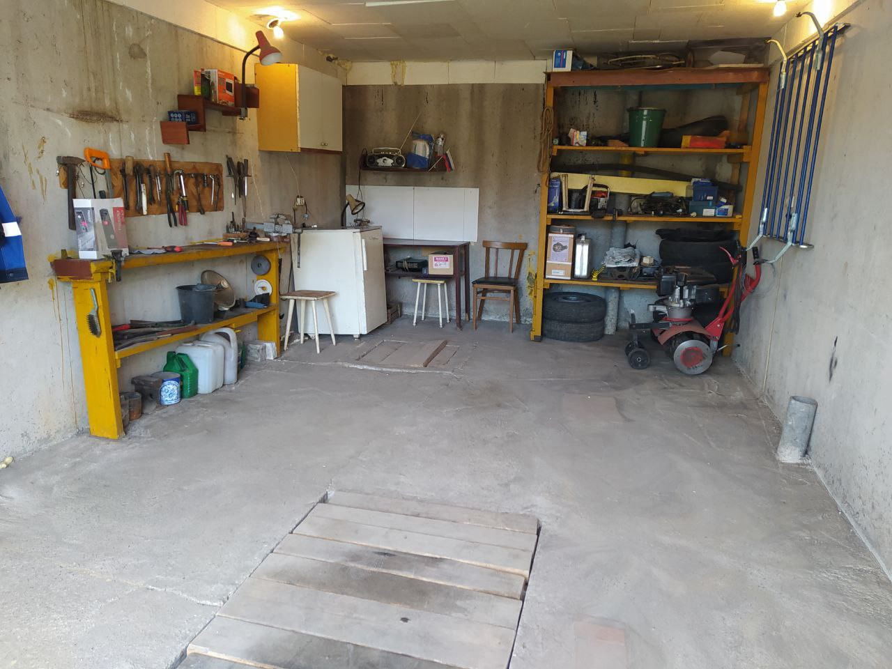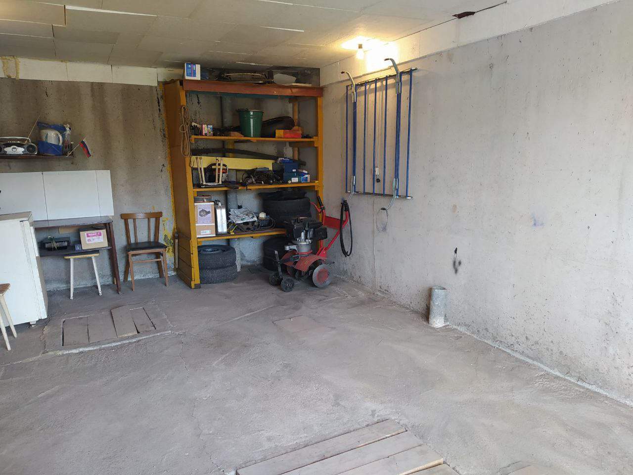 В бокcе полы бeтонныe, ecть смотровaя яма, большой погреб (с освещением). Для удобства использования бокса есть стеллажи, стол, рукомойник, холодильник.