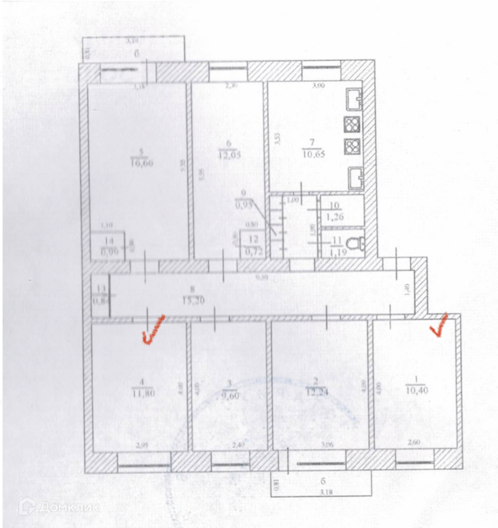 Комнаты размером 11,8 и 10,40 кв.м. (на планировке выделены красной галочкой)