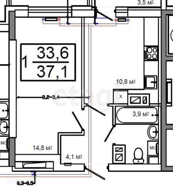 Общая площадь 32.9 м2