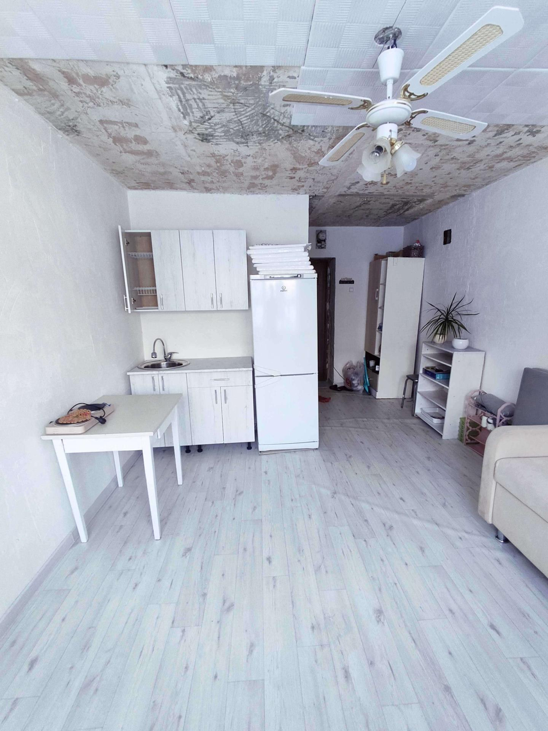 В квартире сделан косметический ремонт, стены оштукатуренные и покрашены белой водоэмульсионной краской, в молодёжном стиле, на полу лежит светлый линолеум под ламинат. Натяжной потолок . Пластиковое окно . Есть душ.