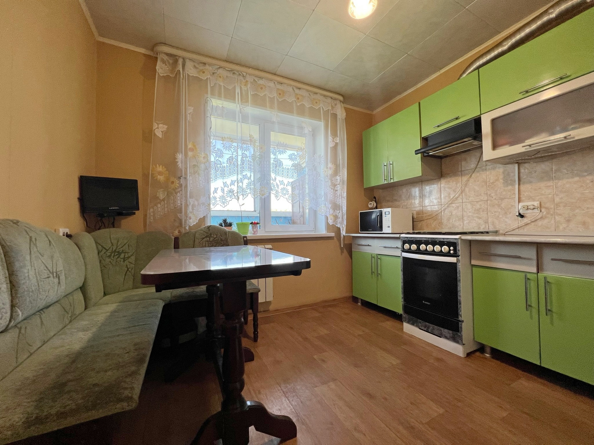 Окна все пластиковые с красивым зеленым видом.