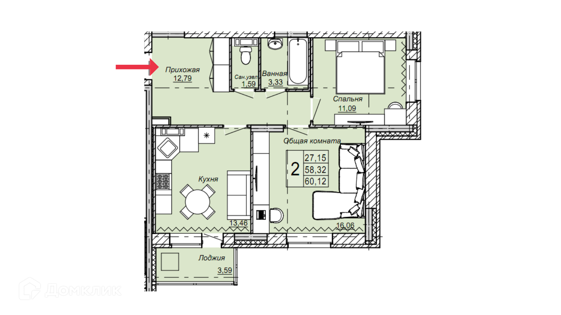 Общая площадь 60.12 м2
