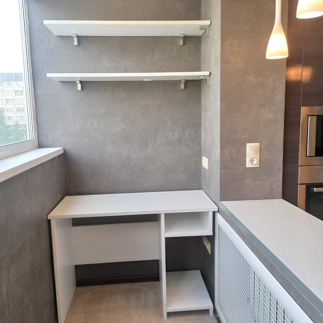 В квартире совмещённая кухня-гостиная с кондиционером, полноценные детская и взрослая спальни. К кухне присоединена лоджия, в которой размещён кабинет с электрическим тёплым полом. На второй лоджии имеется потолочная сушилка и стеллажи для хранения габаритных вещей. Просторный тамбур со скамейкой и обувницей. В тамбуре можно разместить детский сезонный транспорт.