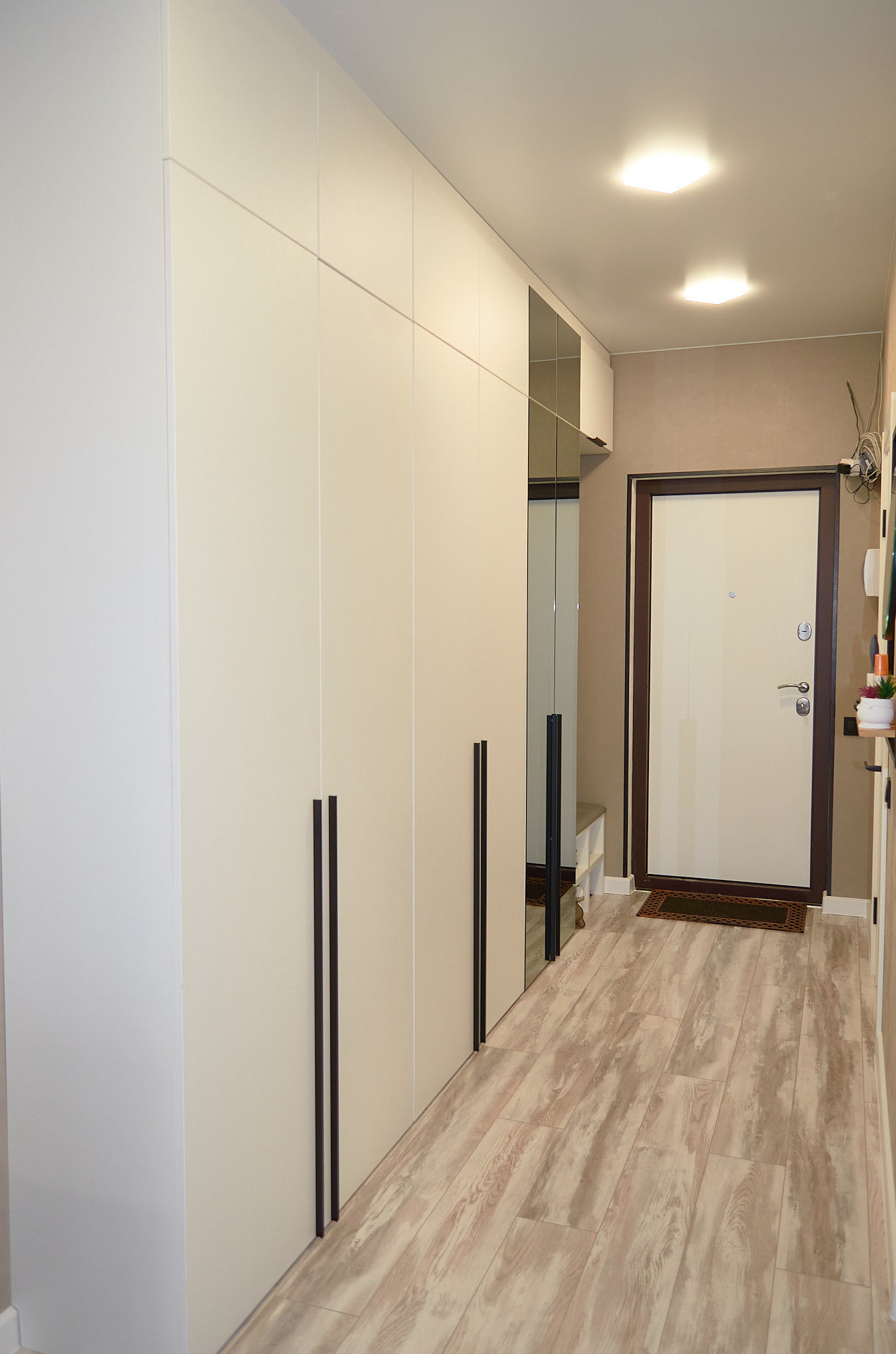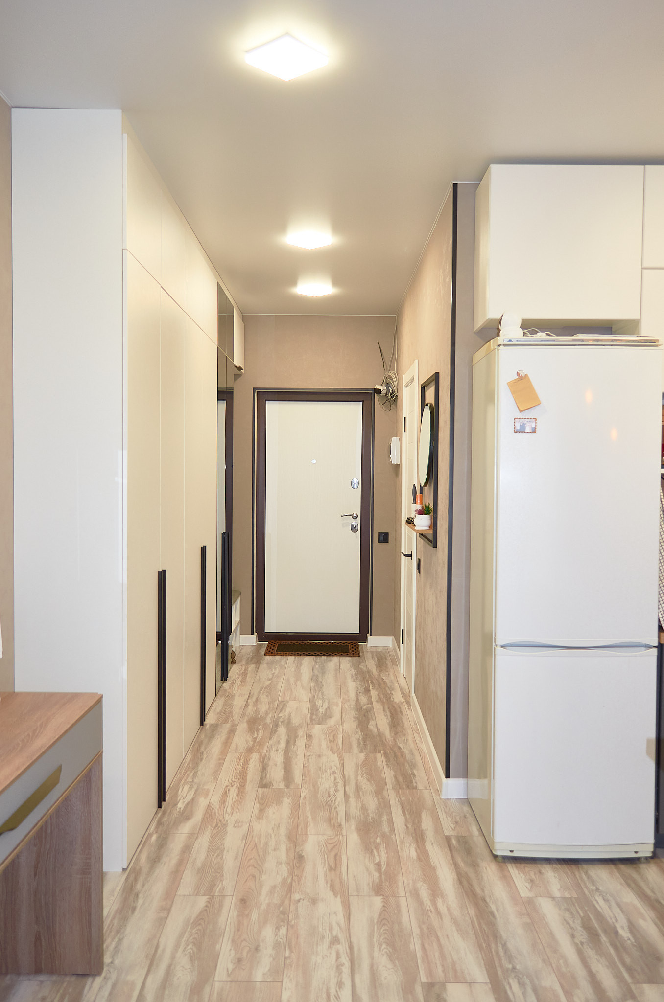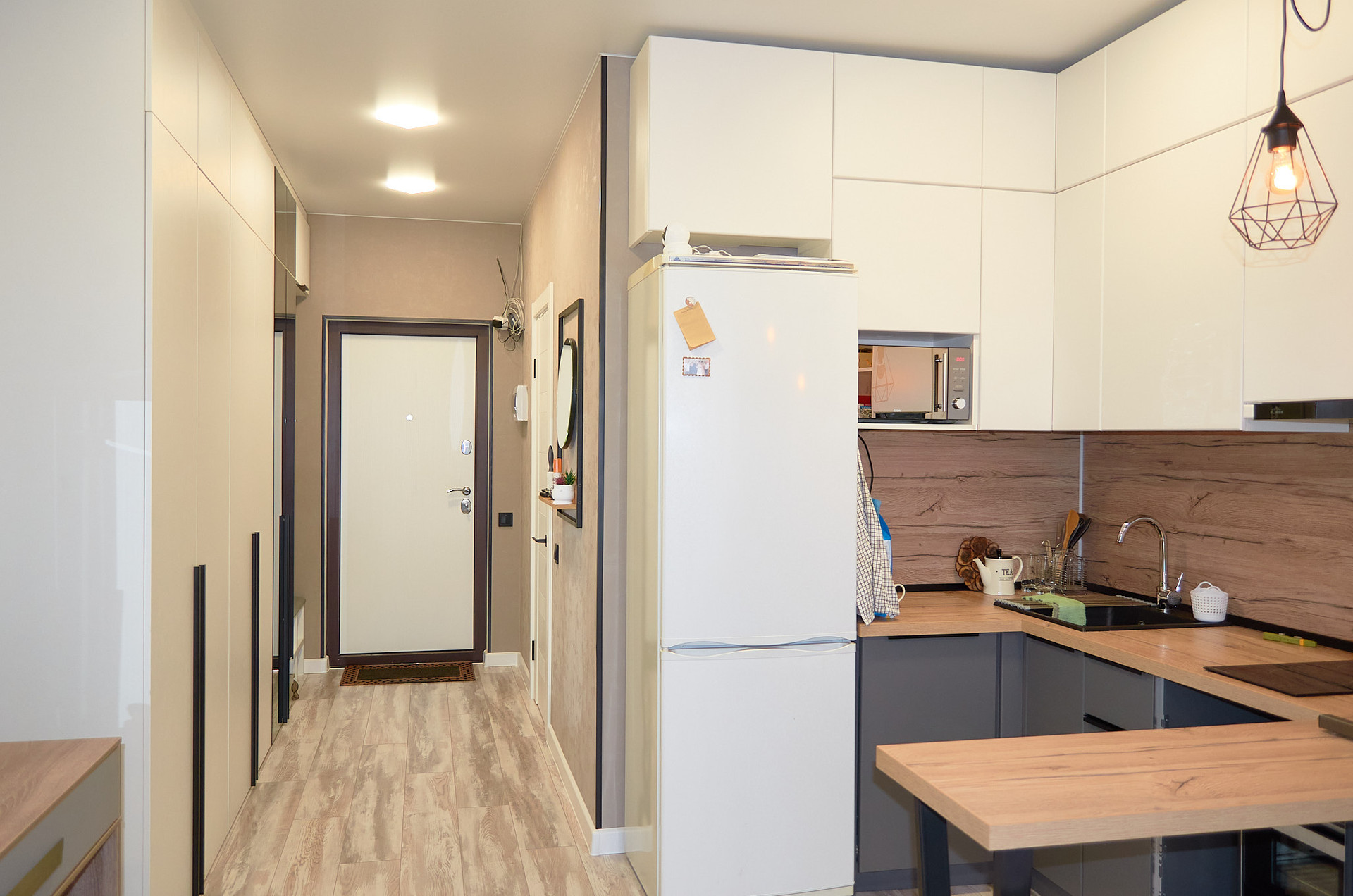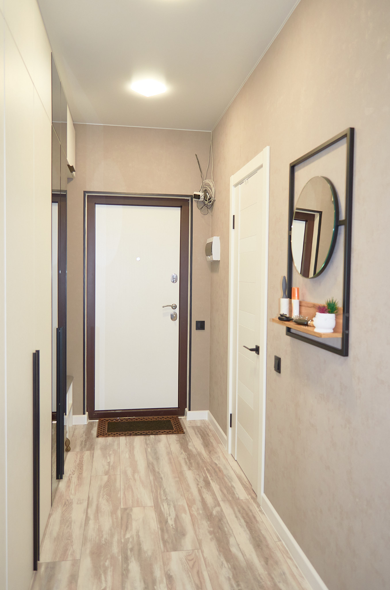 На полу - ламинат, потолок – натяжной, стены - современные обои.