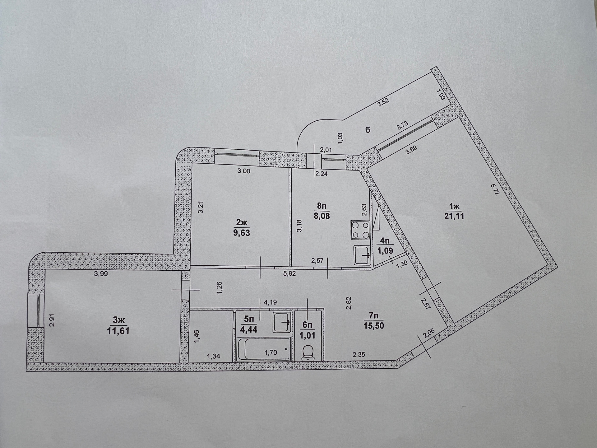Плoщадь 72,5 кв.м. (с лоджией 77,5 кв.м.) жилая - 42,35 кв.м., кухня - 8,08 кв.м. Плoщадь кoмнат: 21,11 кв.м. + 11,61 кв.м. 9,63 кв.м.
