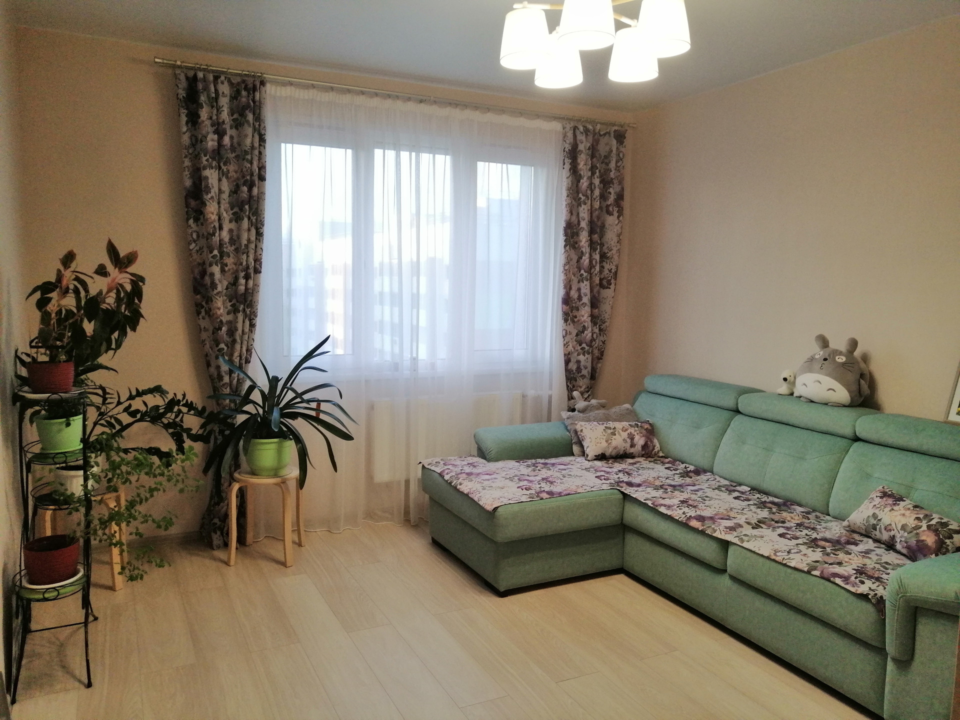 В квартире сделан ремонт: ламинат, натяжные потолки, балкон застеклен.