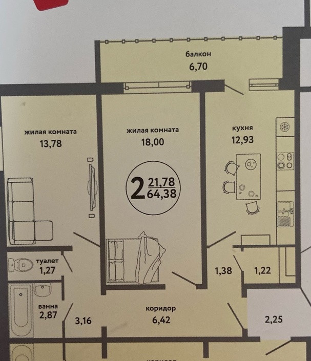 Общая площадь 64.11 м2
