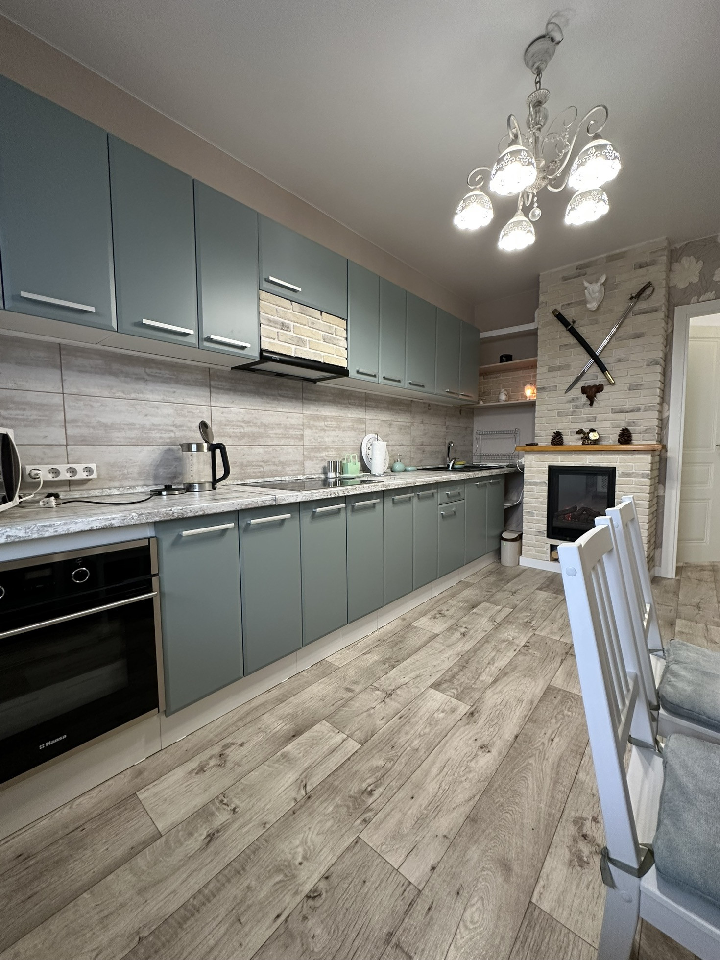 На кухне установлен декоративный камин.Интерьеру присущ минимализм и сдержанность. Все абсолютно новое и не использовалось.