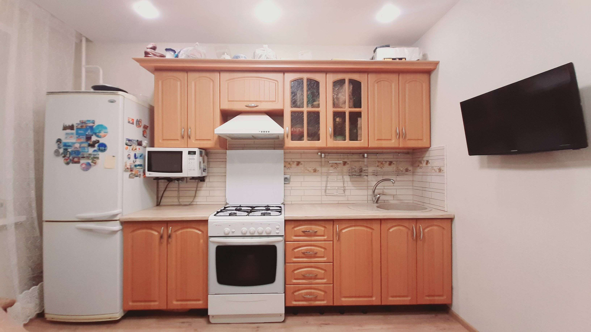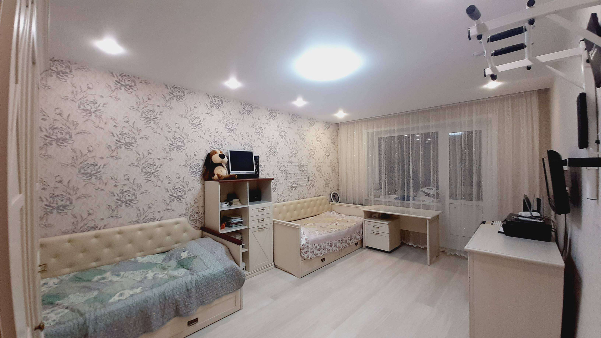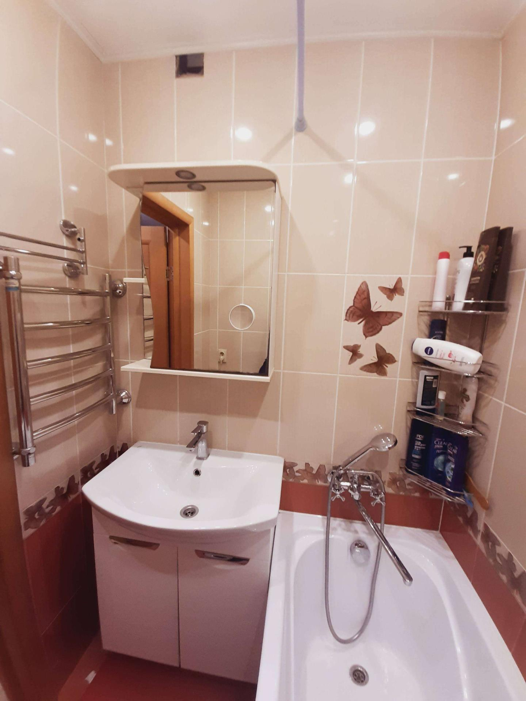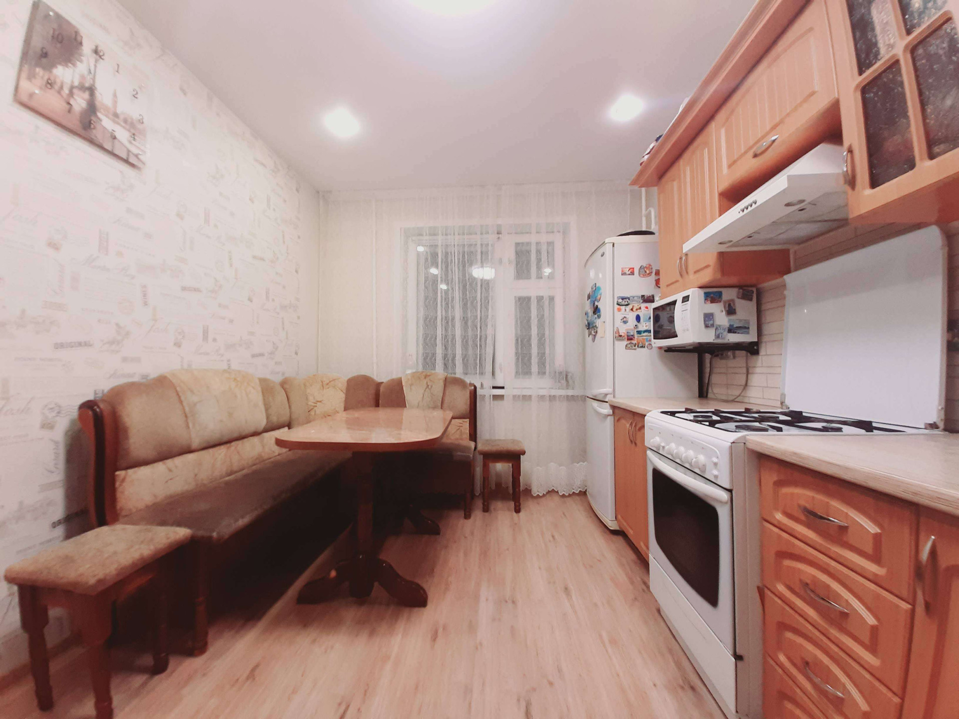 Новым собственникам остается кухонный гарнитур с газовой плитой, стол со стульями, кухонный диван,кухонная вытяжка, все осветительный приборы в квартире и три шкафа-купе в прихожей. Установлены натяжные потолки. Ванная комната и санузел отделан кафелем. Интерьер квартиры выпонен в светлых тонах. В кухне, зал и спальню проведен локальный интернет, установлены кронштейны на стене для установки телевизоров. Установлены и поверены счетчики потребления холодной и горячей воды. электроэнергии, природного газа.