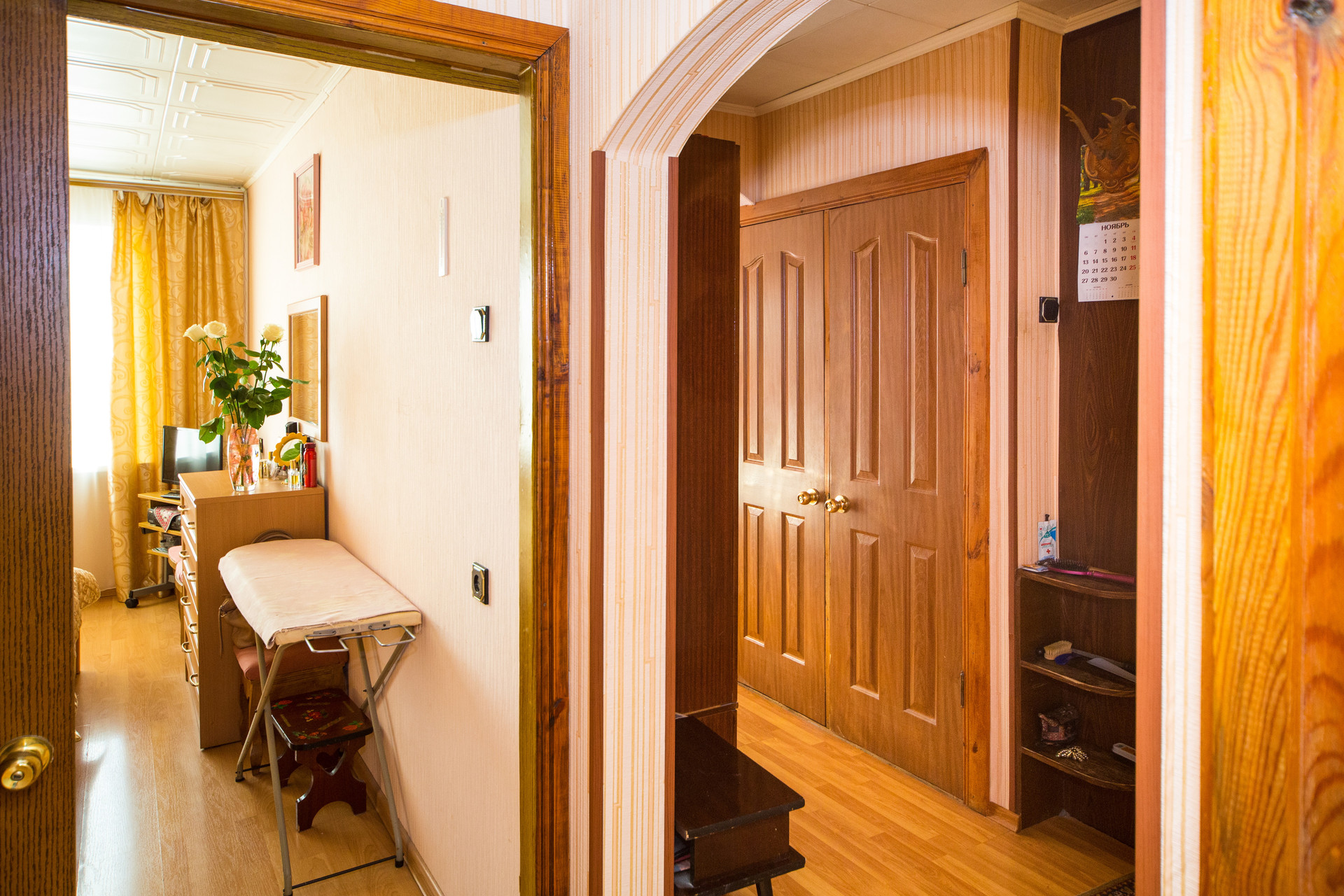 Газовая колонка ,раздельный сан узел ,место под гардероб ,не так давно производилась замена покрытия пола на ламинат.