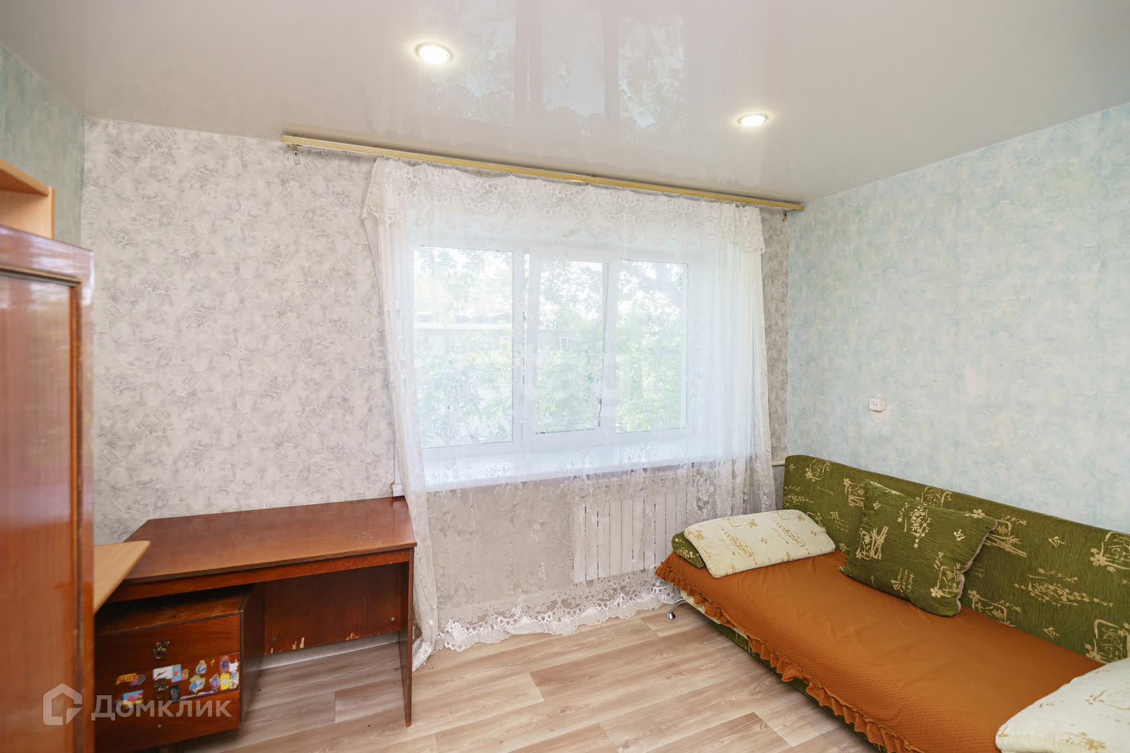 Натяжной потолок в квартире, на полу линолеум, пластиковое окно.