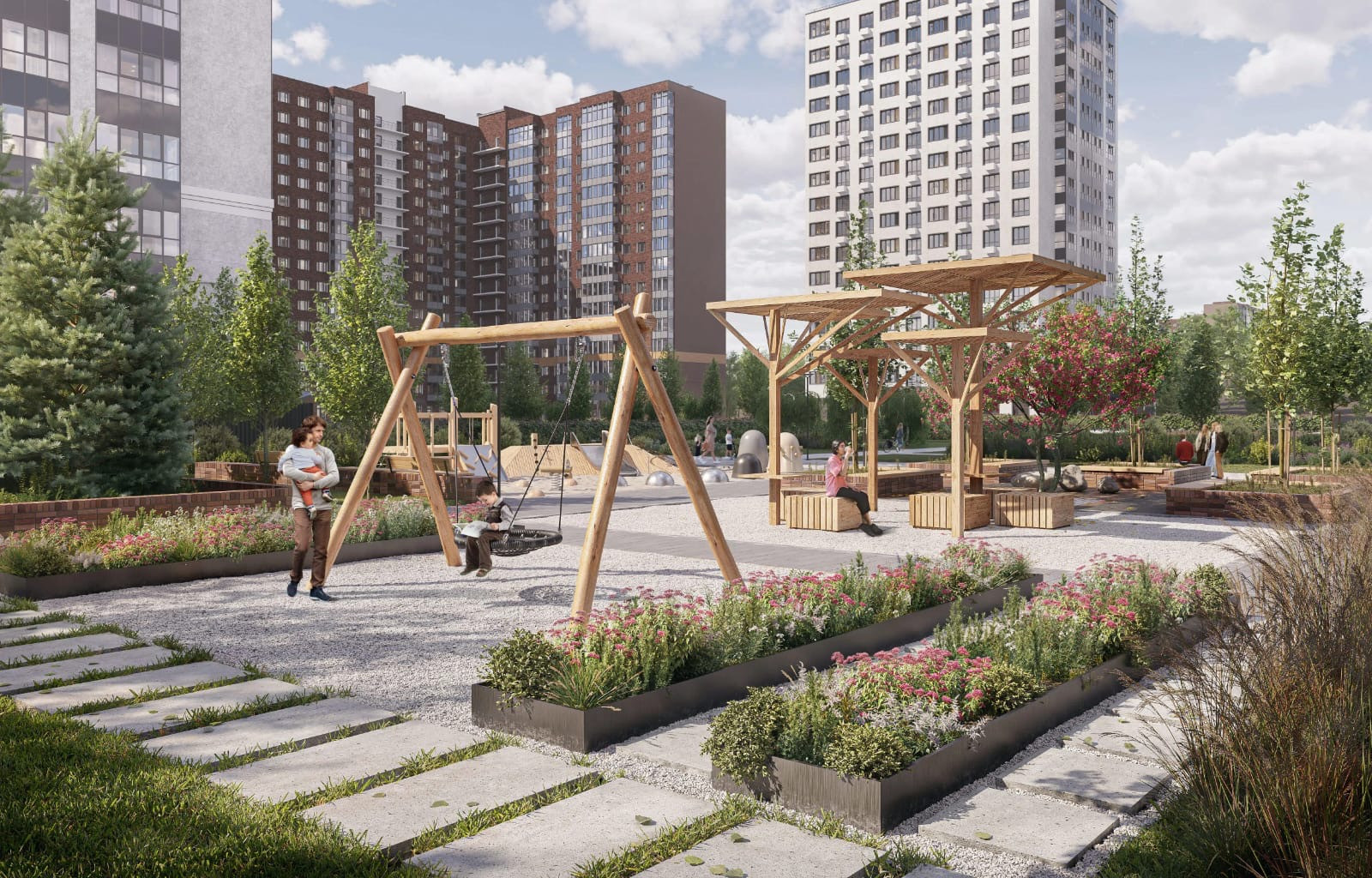 Детские игровые и спортивные площадки, ворк-аут зоны на свежем воздухе.