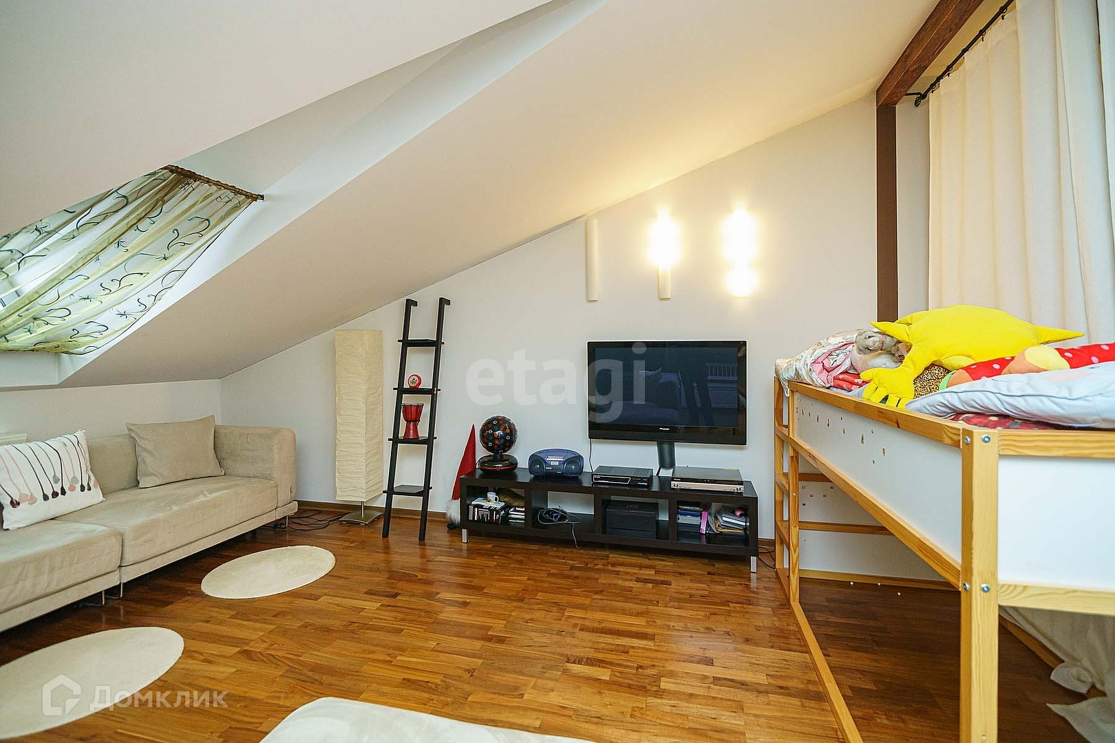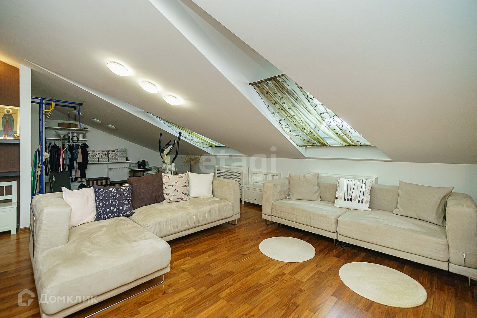 Так же на мансарде находится гостевая лаундж зона с двумя диванами - можно встречаться с друзьями, устраивать уютные посиделки за просмотром фильмов, там много свободного пространства для занятий йогой и фитнесом.