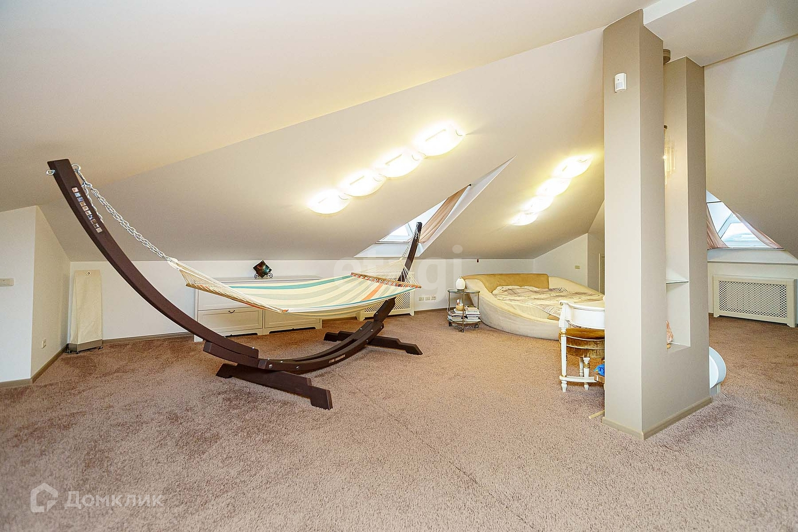 На втором мансардном этаже находятся 2 мастер-спальни с личными санузлами, гардеробными и подсобными помещениями для хранения сезонных вещей. В одном санузле есть итальянская ванная с джакузи. В одной из спален установлен гамак. И круглая кровать фабрики 8 марта.