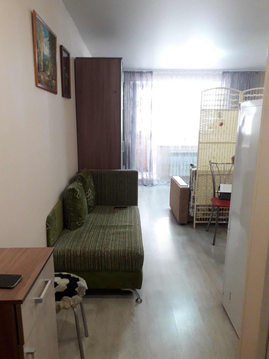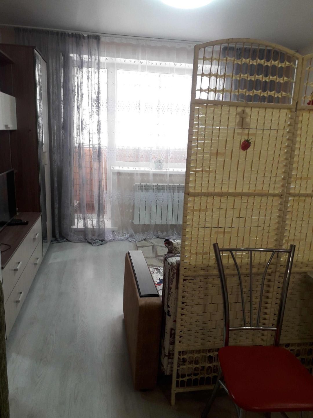 Квартира- студия с отличным ремонтом Вариант- заехал и живи.В ванной современная плитка, вся сантехника в идеальном состоянии,на полу ламинат, натяжные потолки, стильный кухонный гарнитур и стенка остаются в подарок новым жильцам.1 собственник, 4 метровая  лоджия с видом во двор.Недалеко остановка , магазины, детский сад в 5 минутах ходьбы, рядом строится спортивный комплекс.ВАША КВАРТИРА ЖДЕТ ВАС.ТОРГ ОБСУЖДАЕТСЯ.