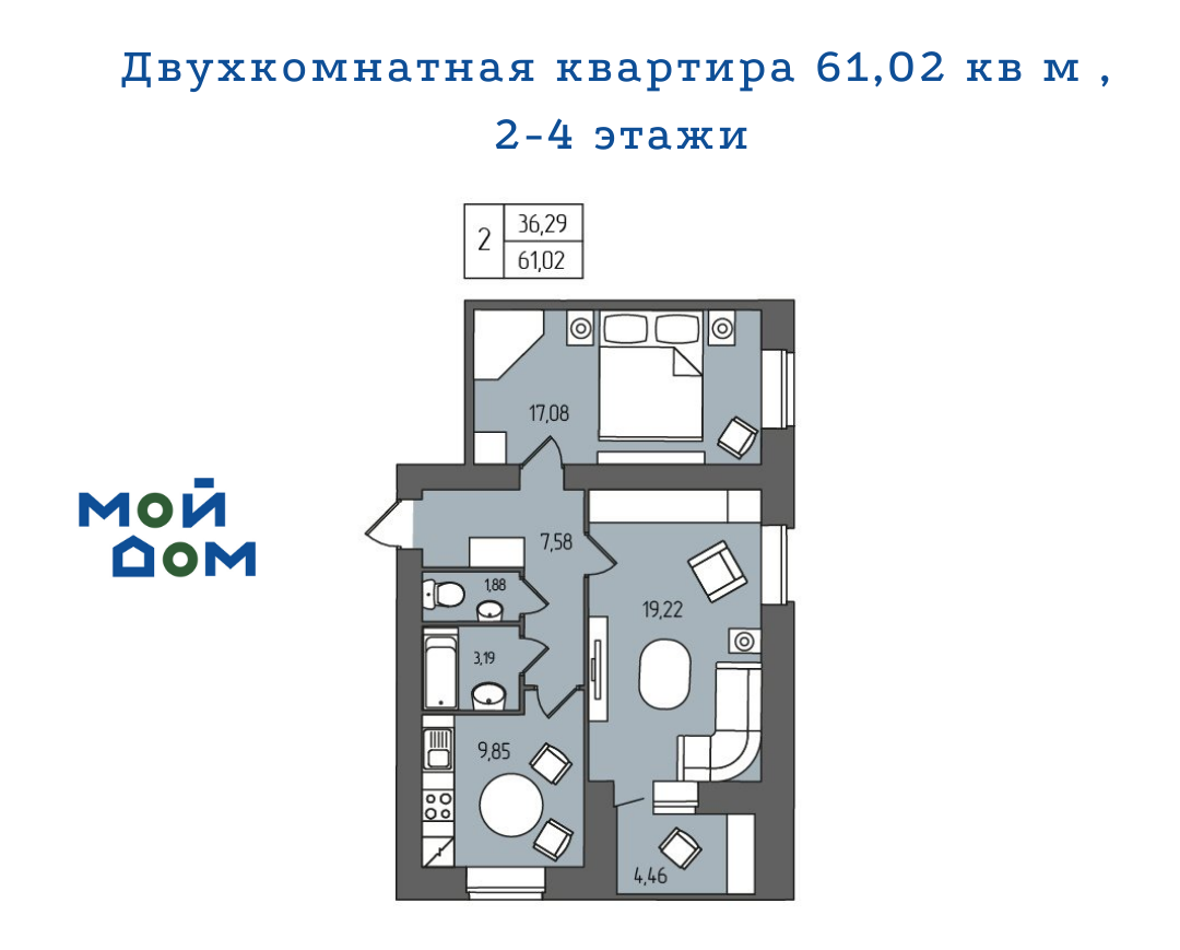 Общая площадь 59.6 м2