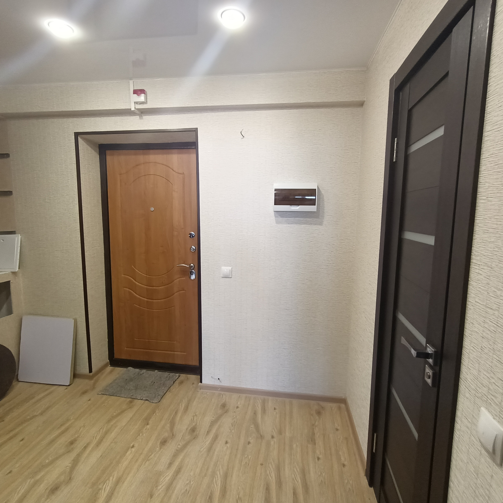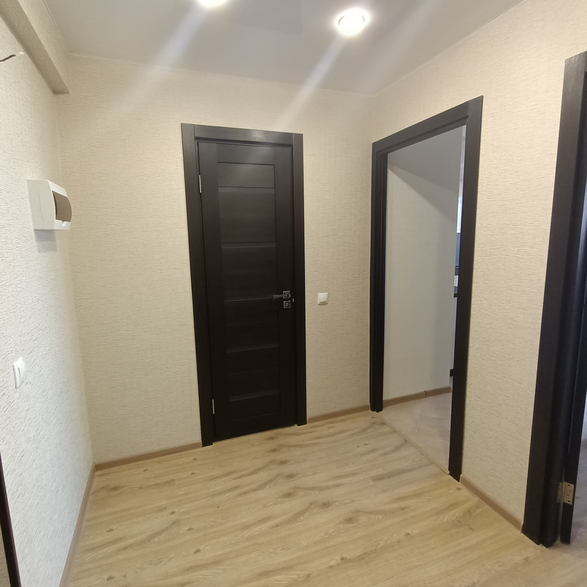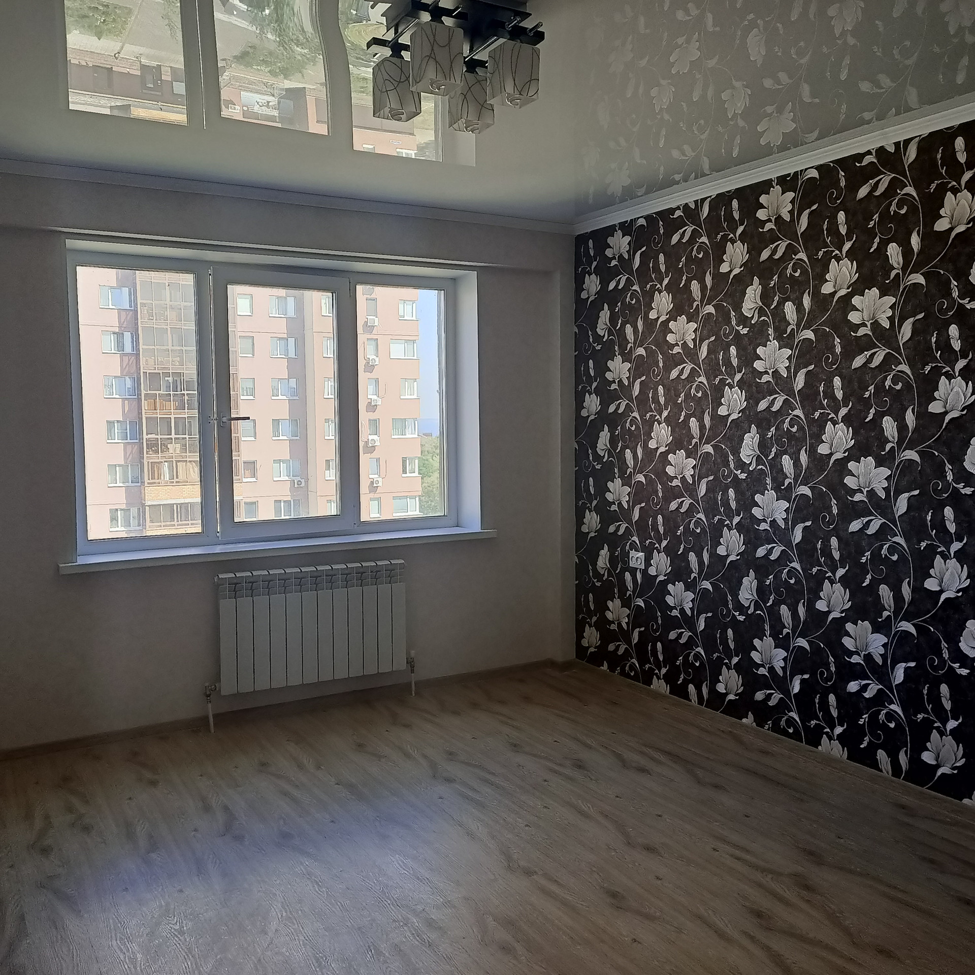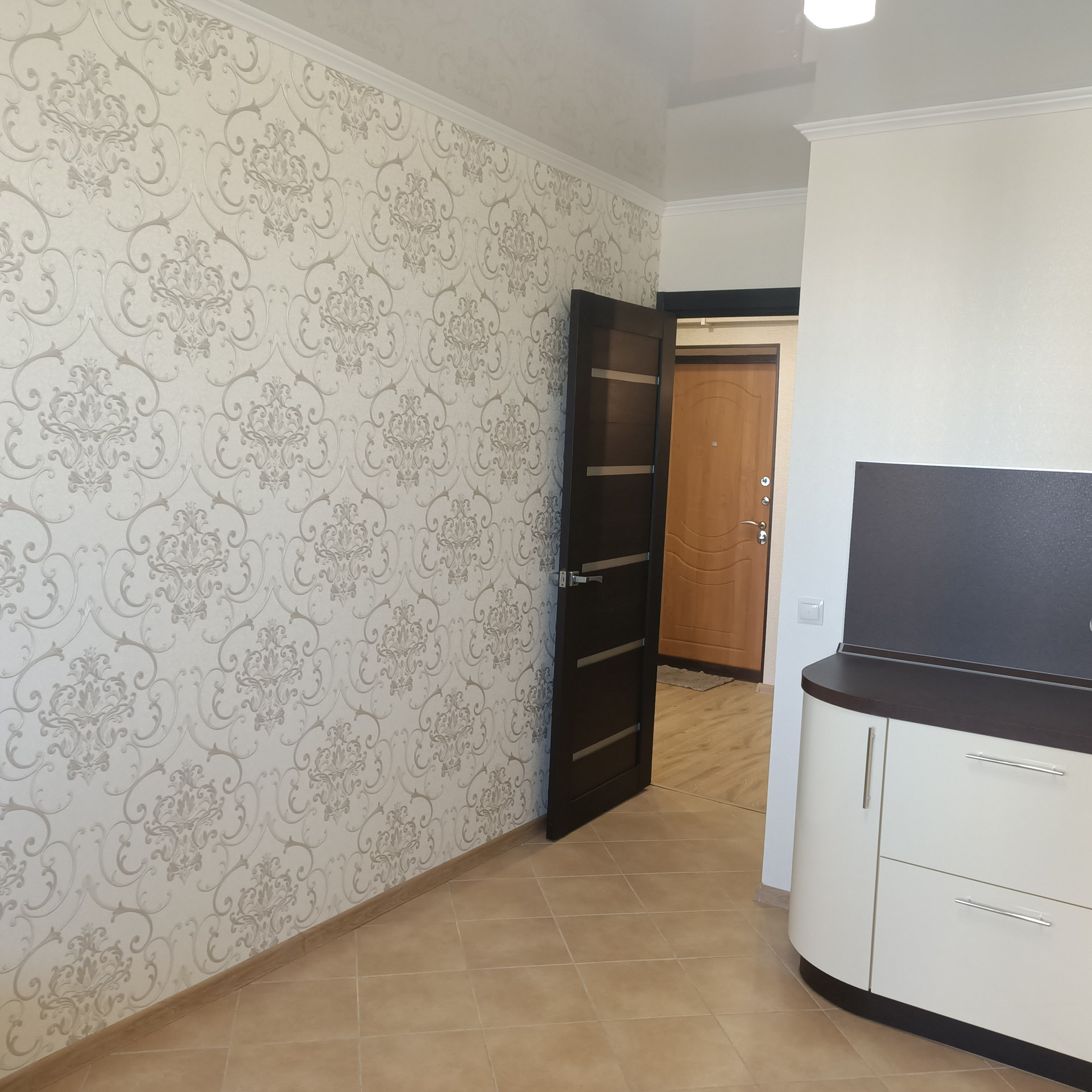 Пол–ламинат, в кухне и коридоре -керамогранит, санузел кафель. Потолки – натяжные.