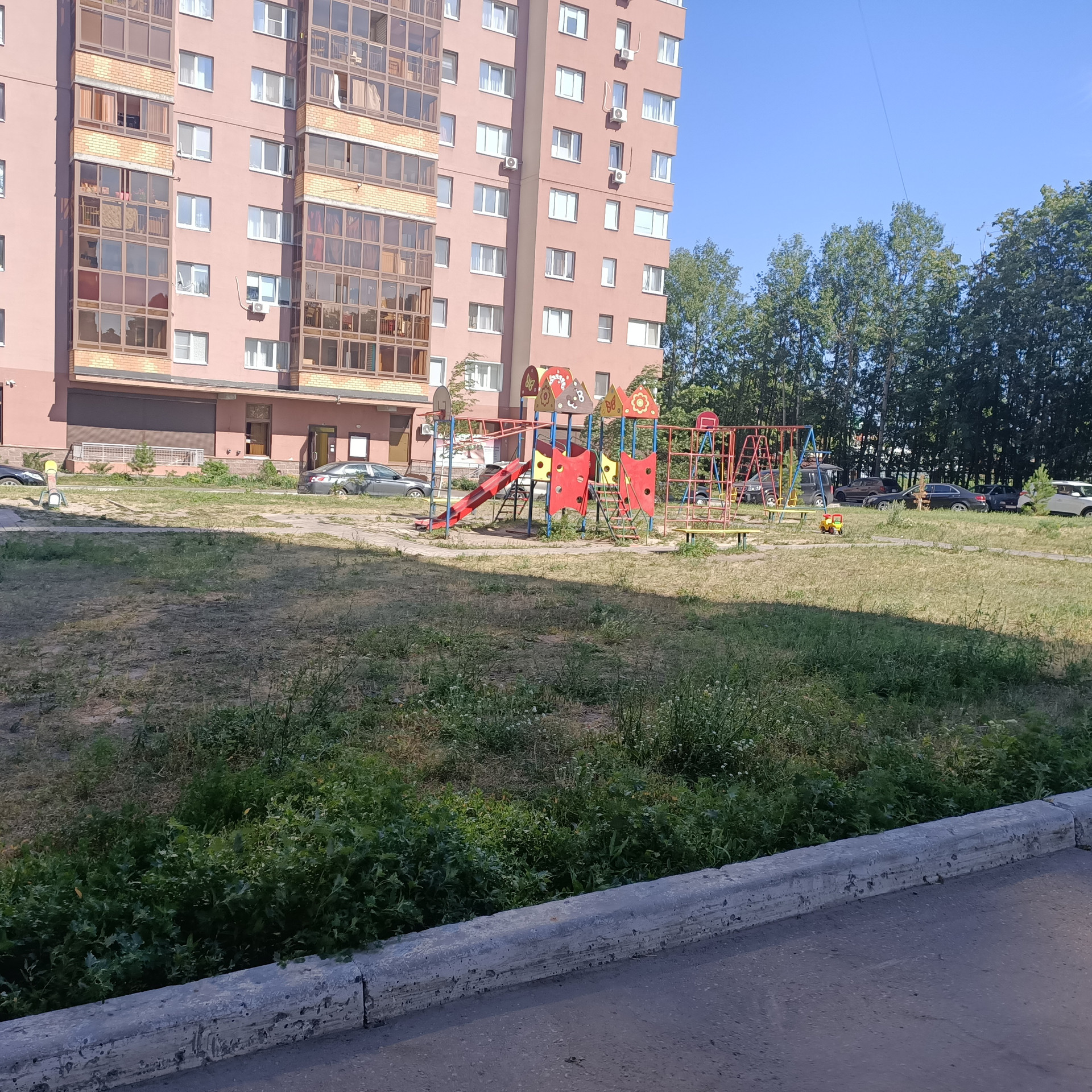 Во дворе детская площадка, парковка авто.