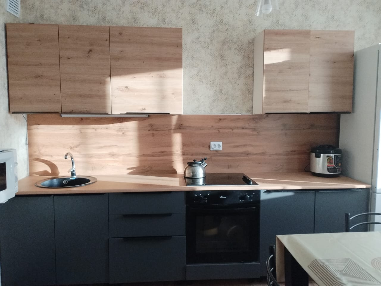 Остается кухонный гарнитур с варочной панелью и духовкой, диван,осветительные приборы и занавески.