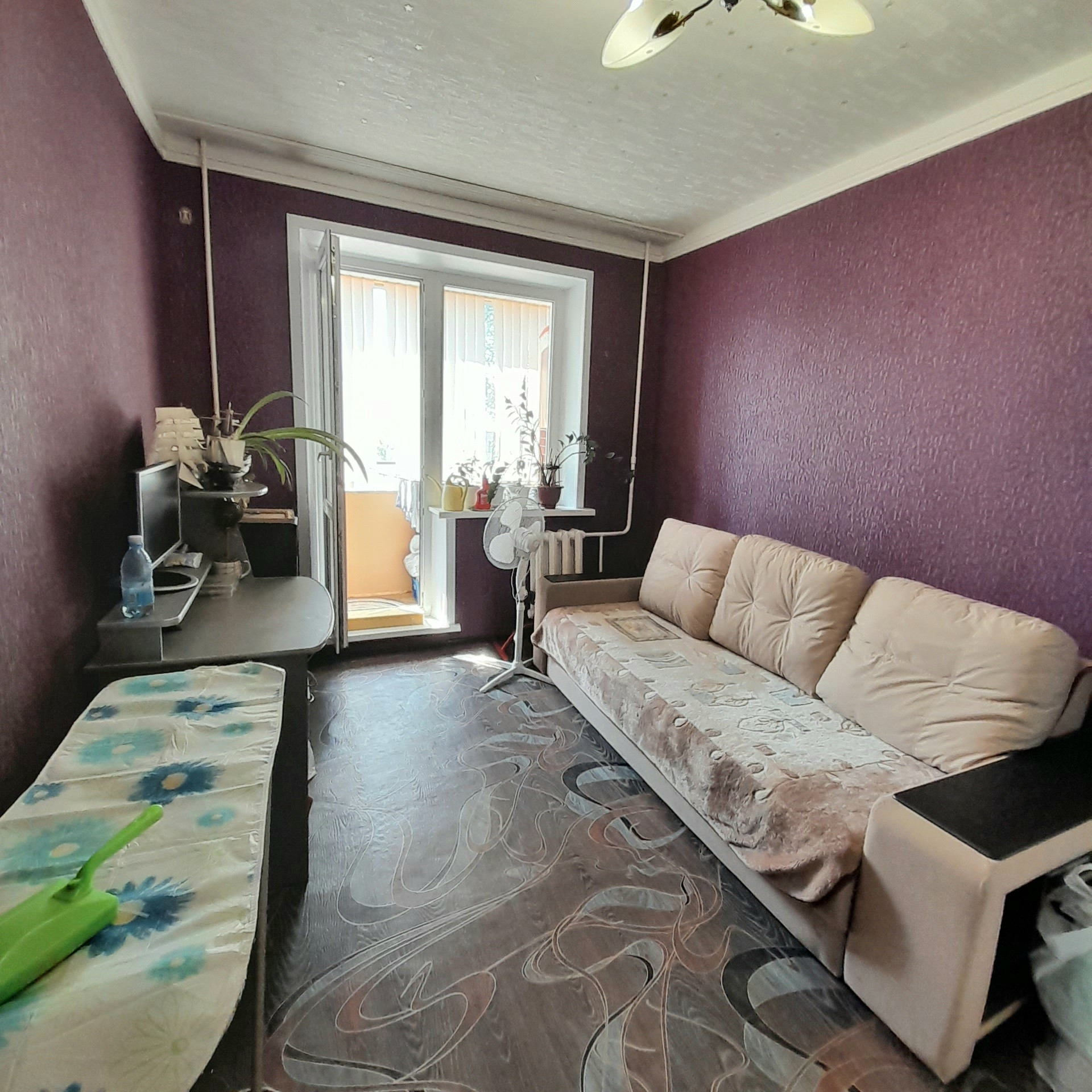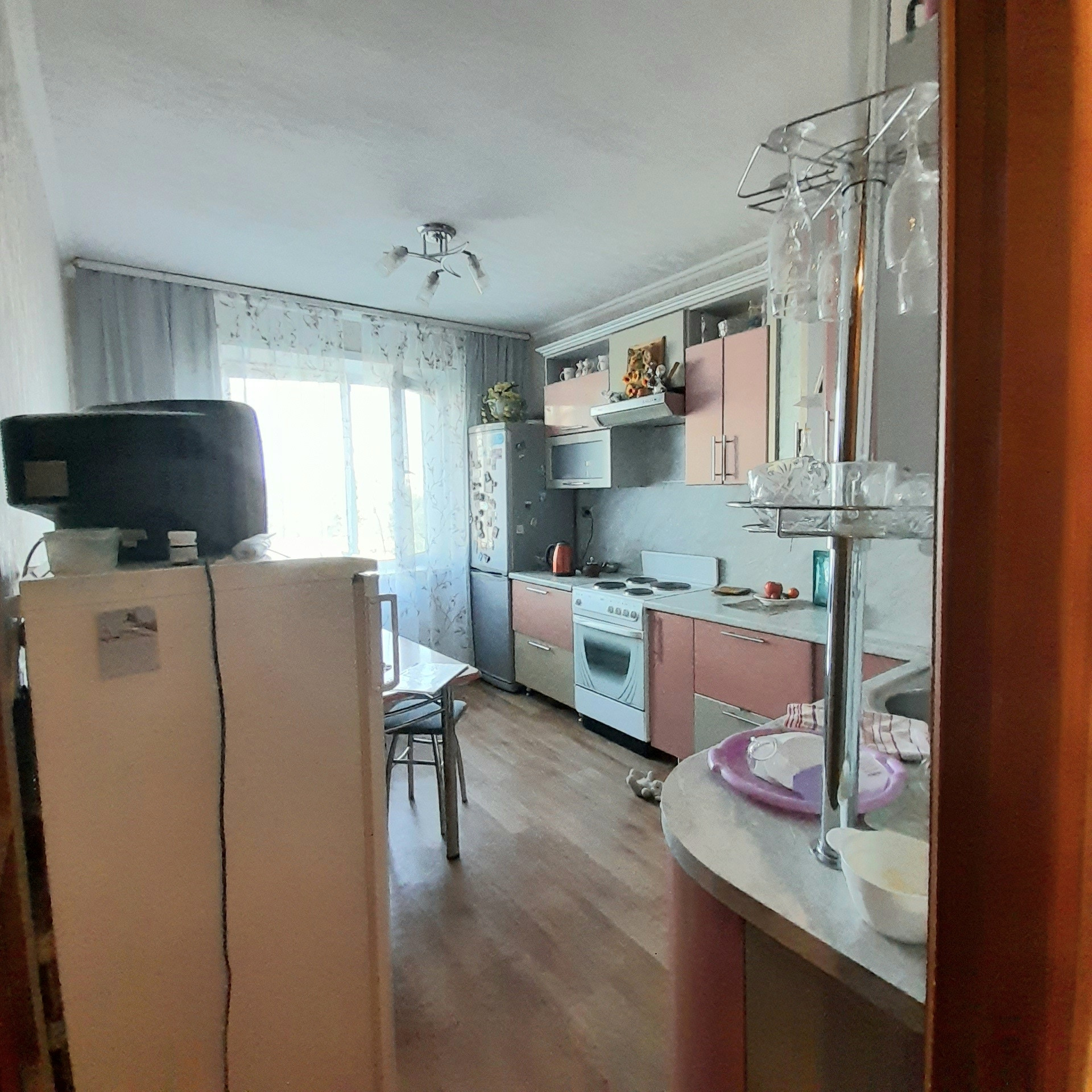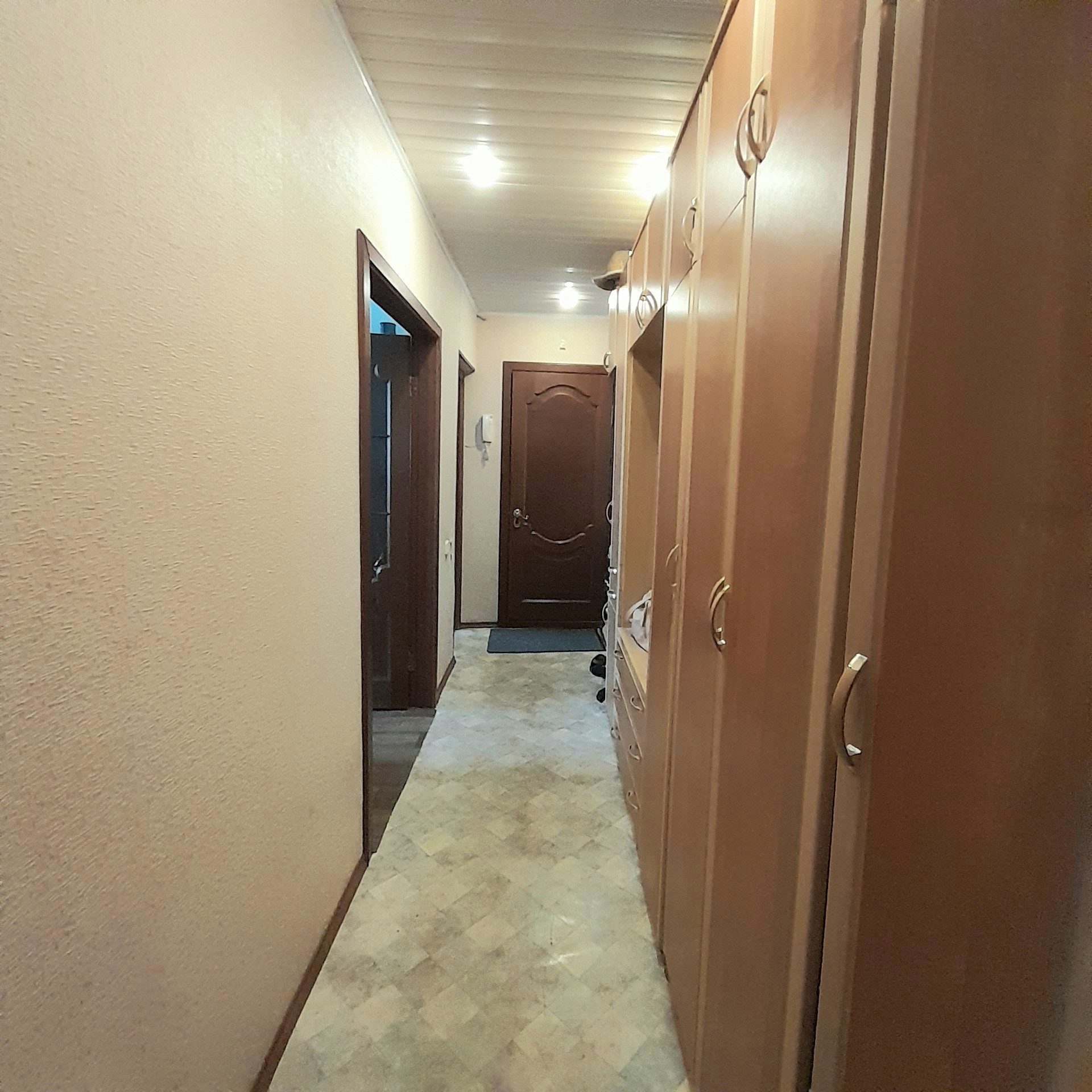 Бронированная и филёнчатые двери, пластиковые окна, полулоджия и балкон застеклены и отделаны вагонкой.
