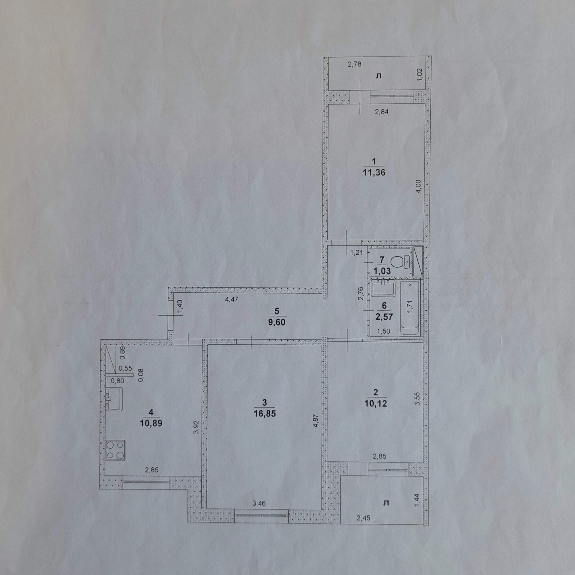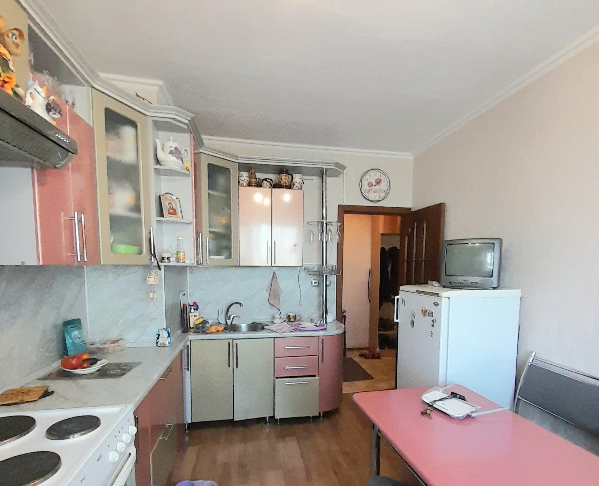Вместительный угловой встроенный кухонный гарнитур с электроплитой, ванная и санузел "под ключ".