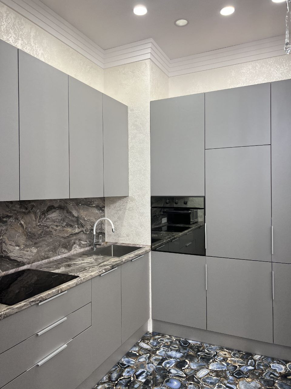 ГОСТИНАЯ/КУХНЯ. Просторная совмещённая кухня с гостиной. На кухне имеется: электрическая варочная панель; духовой шкаф; холодильник; вытяжка; мойка; гибкий кран; посудомоечная машина; люстра; большое количество шкафчиков и полок. В гостиной имеется: просторный диван; кресло; обеденный стол на 6-ть персон; 6-ть стульев; телевизор; WIFI-роутер; телевизор; люстра. Площадь — 30,1 м².