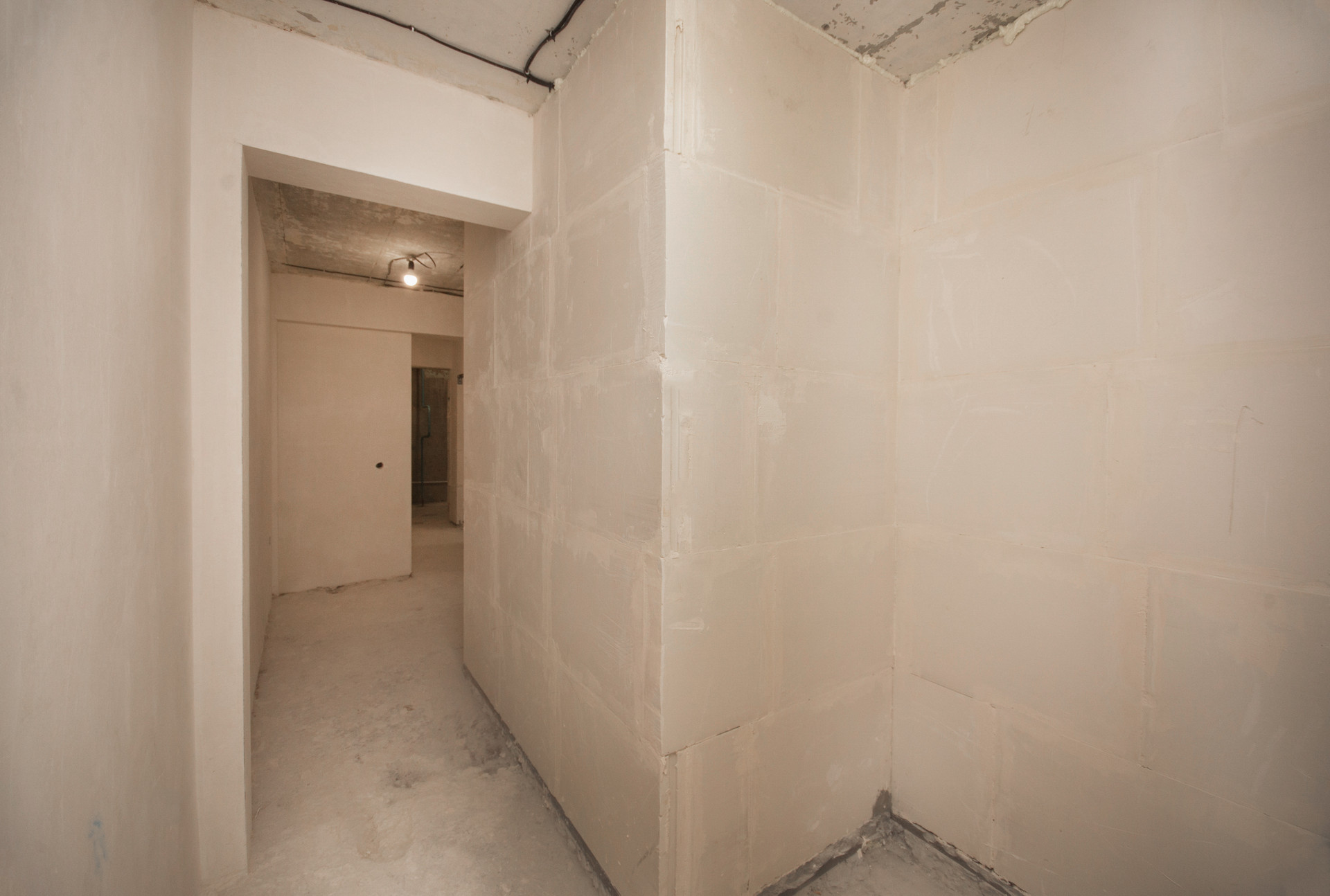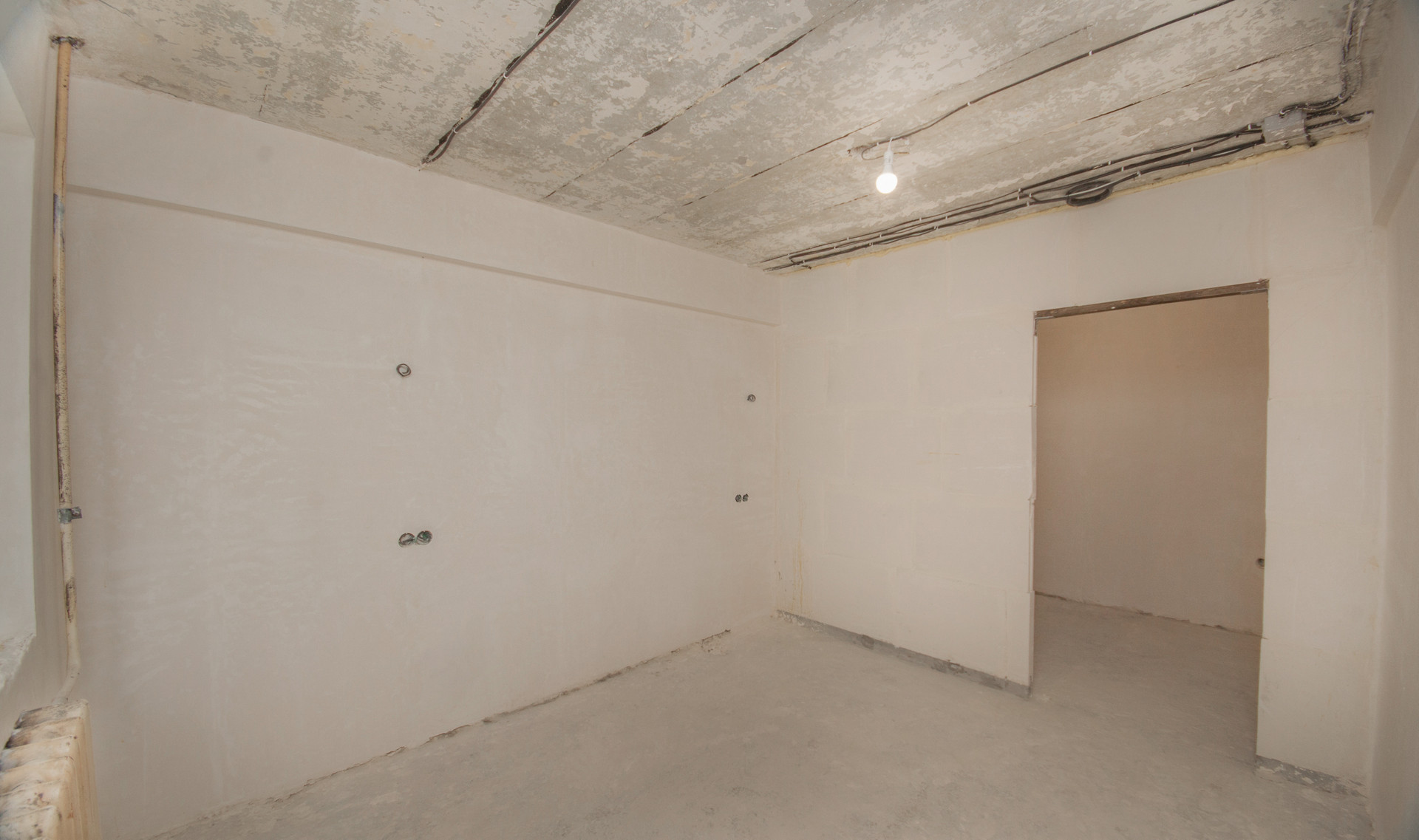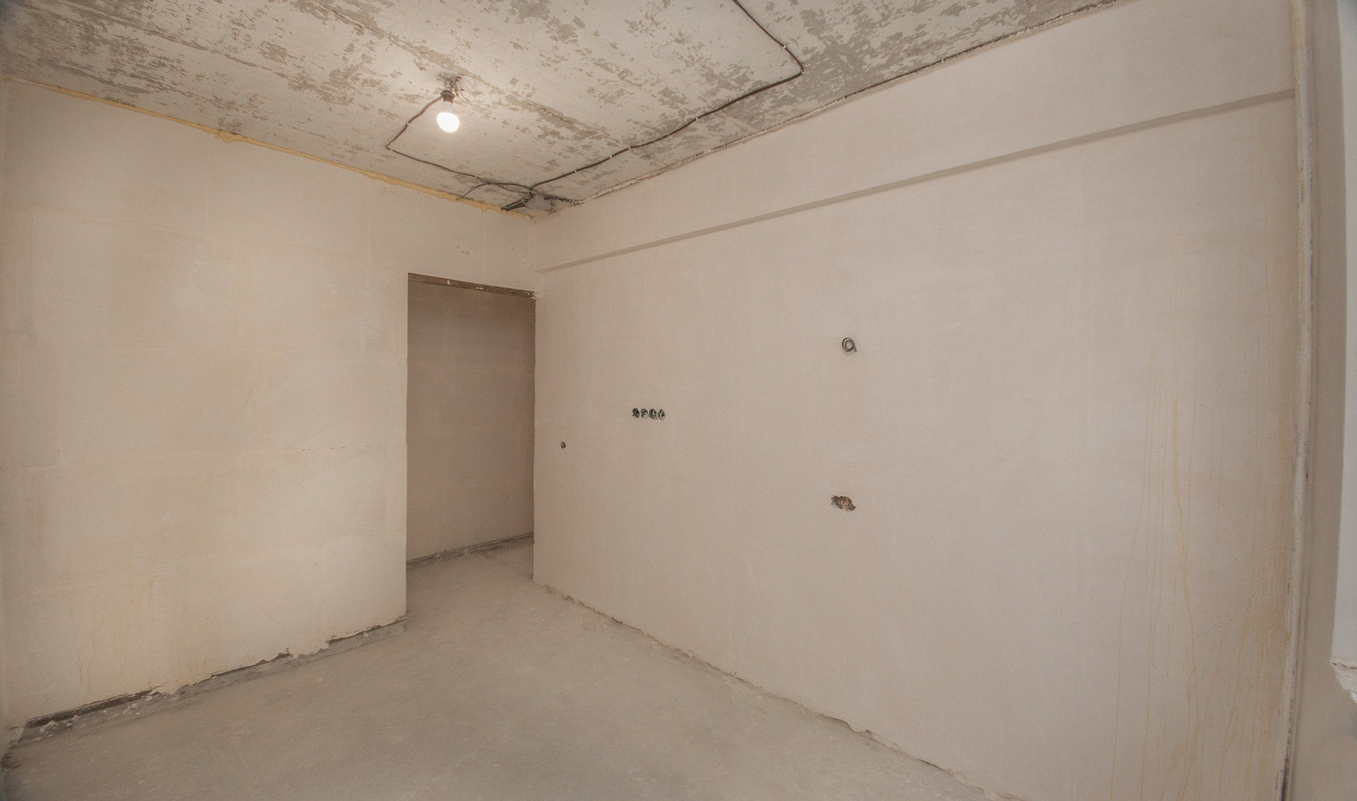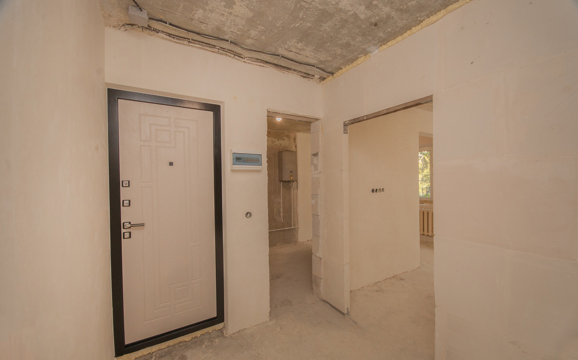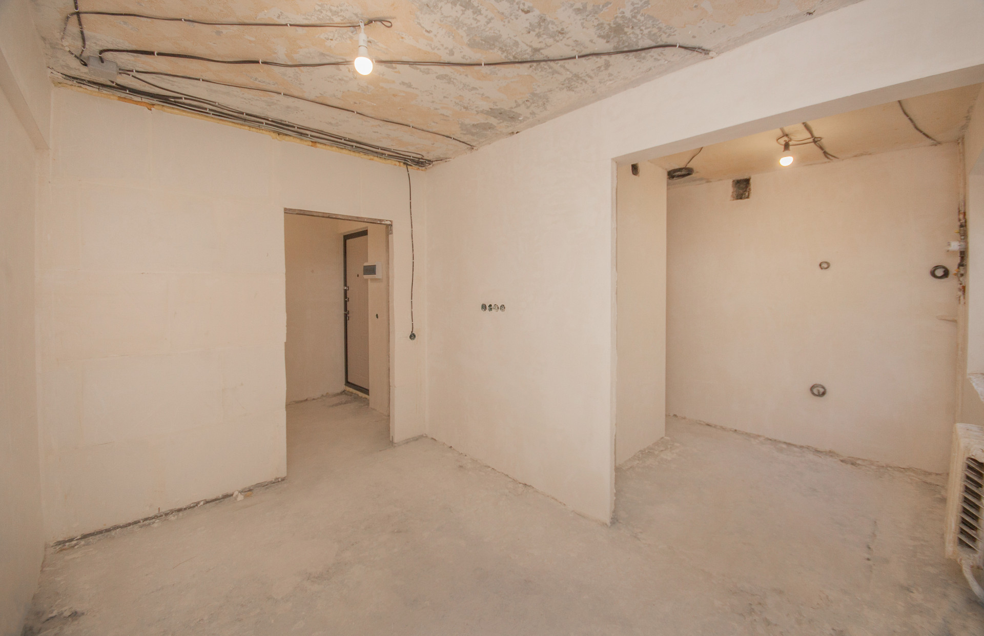 Планировка включает в себя 2 изолированные комнаты, кухню-гостиную, а также балкон и просторный коридор. Несомненным плюсом квартиры является то, что в ней уже начаты ремонтные работы, а именно: выполнены все демонтажные работы, выложены все стены, проведена новая электрика, установлены счетчики на все коммунальные ресурсы, стены оштукатурены по маякам, во всех комнатах установлены пластиковые окна, а также качественная входная дверь.