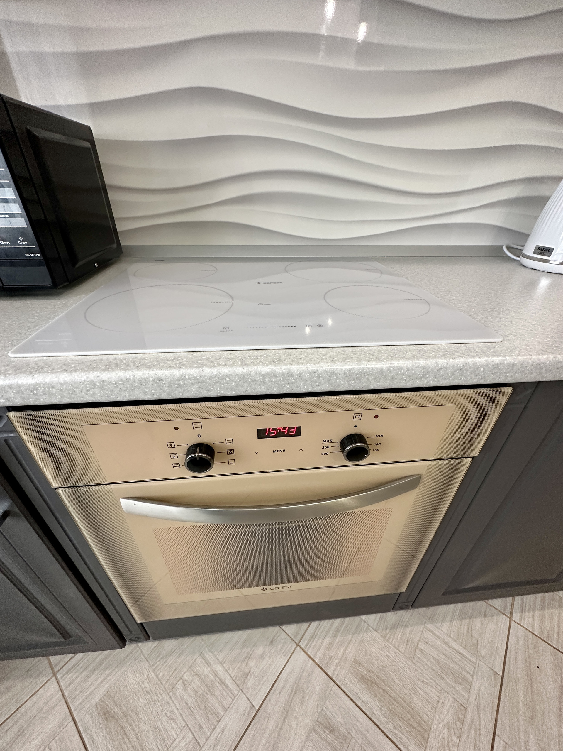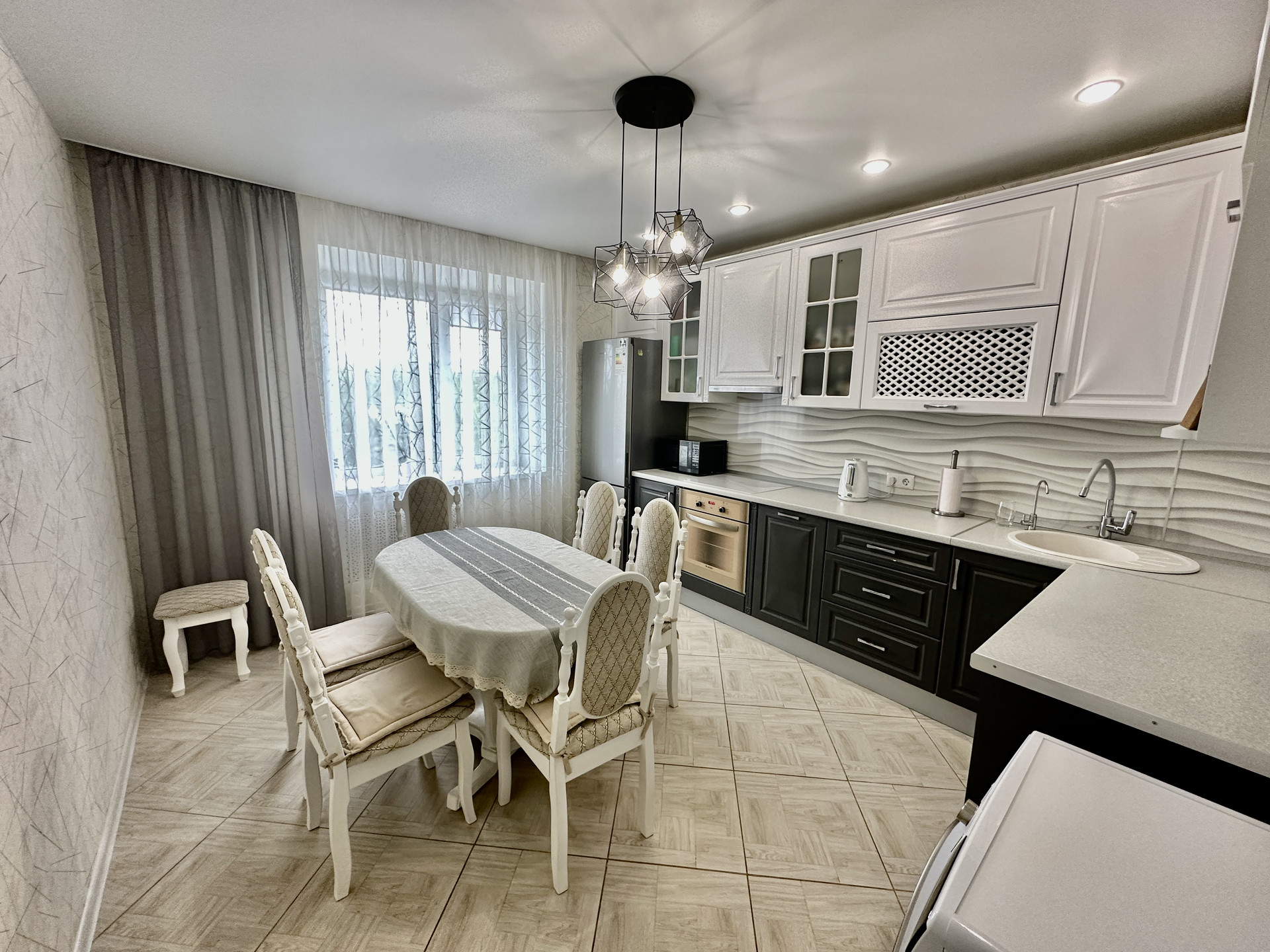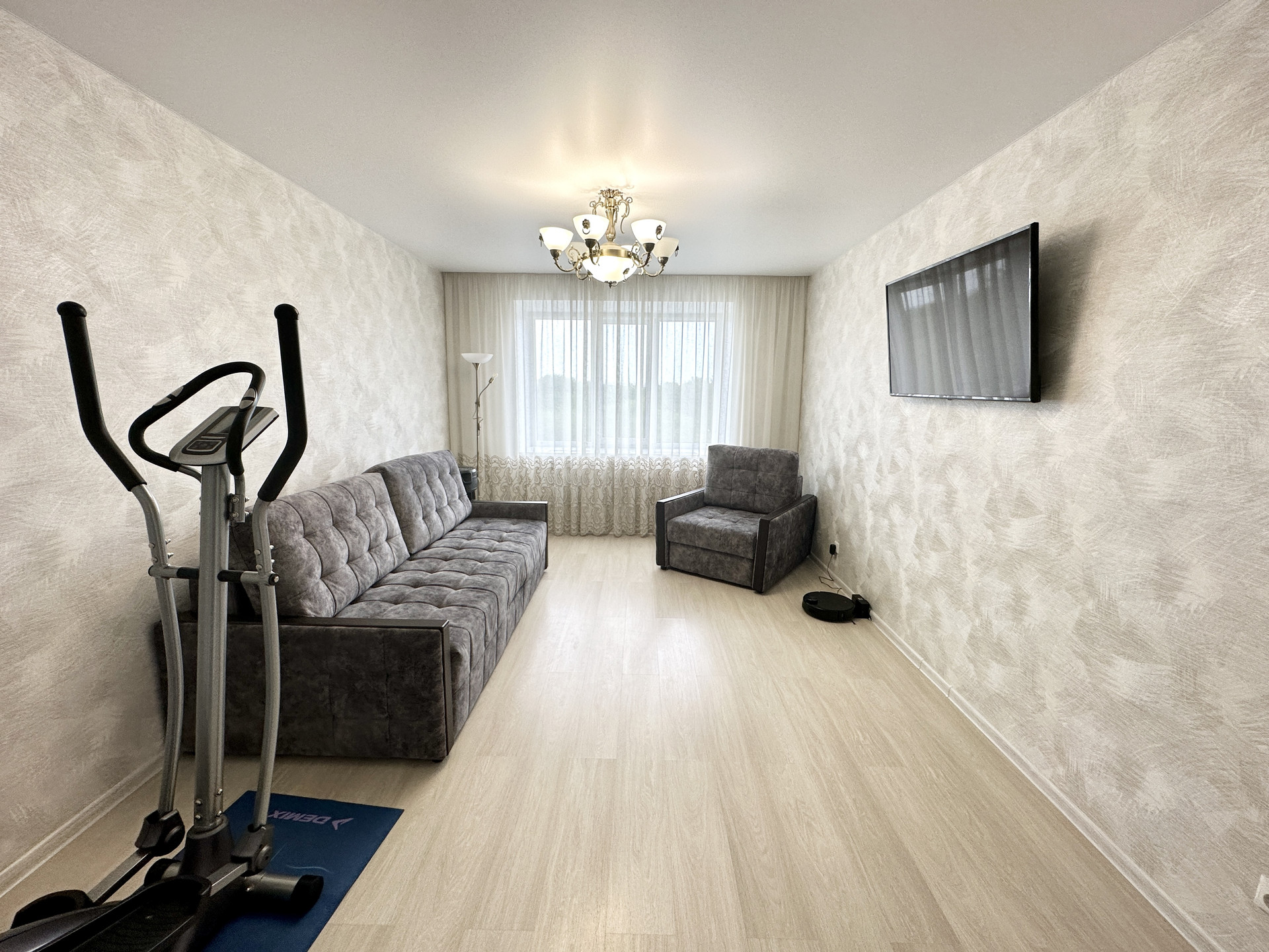 Остается кухонный гарнитур производства Беларусь с плитой и духовкой, раздвижной стол со стульями из массива дерева, так же вся техника которая присутствует на фото.