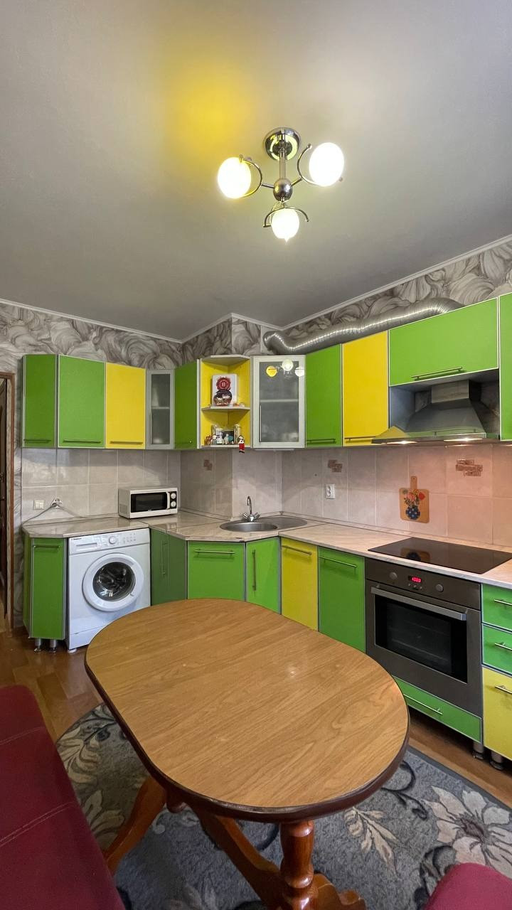 Кухня с новым ремонтом, кухонным гарнитуром, встраиваемой техникой (остаётся новая электрическая плита, духовка, холодильник и стиральная машина, вытяжка с подсветкой).