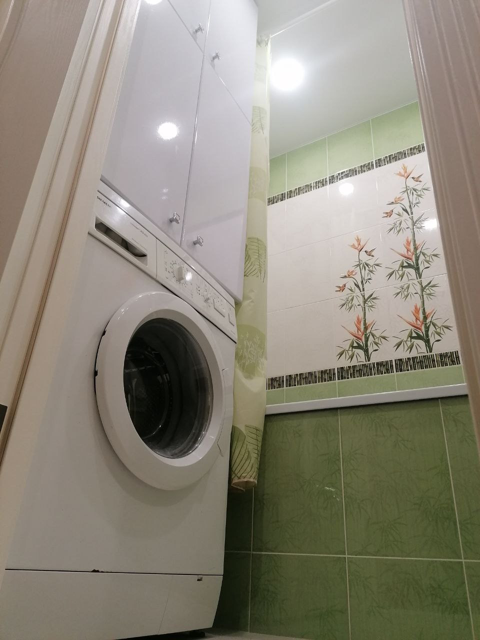 Ванная и туалет в современной отделке, со стиральной машиной и водонагревателем, скрытым в шкафу.