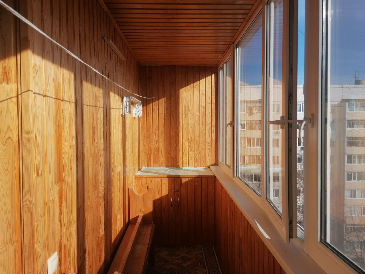 Ламинат, натяжные потолки, пластиковые окна с жалюзи; на лоджии отделка евровагонкой, пластиковые окна.
