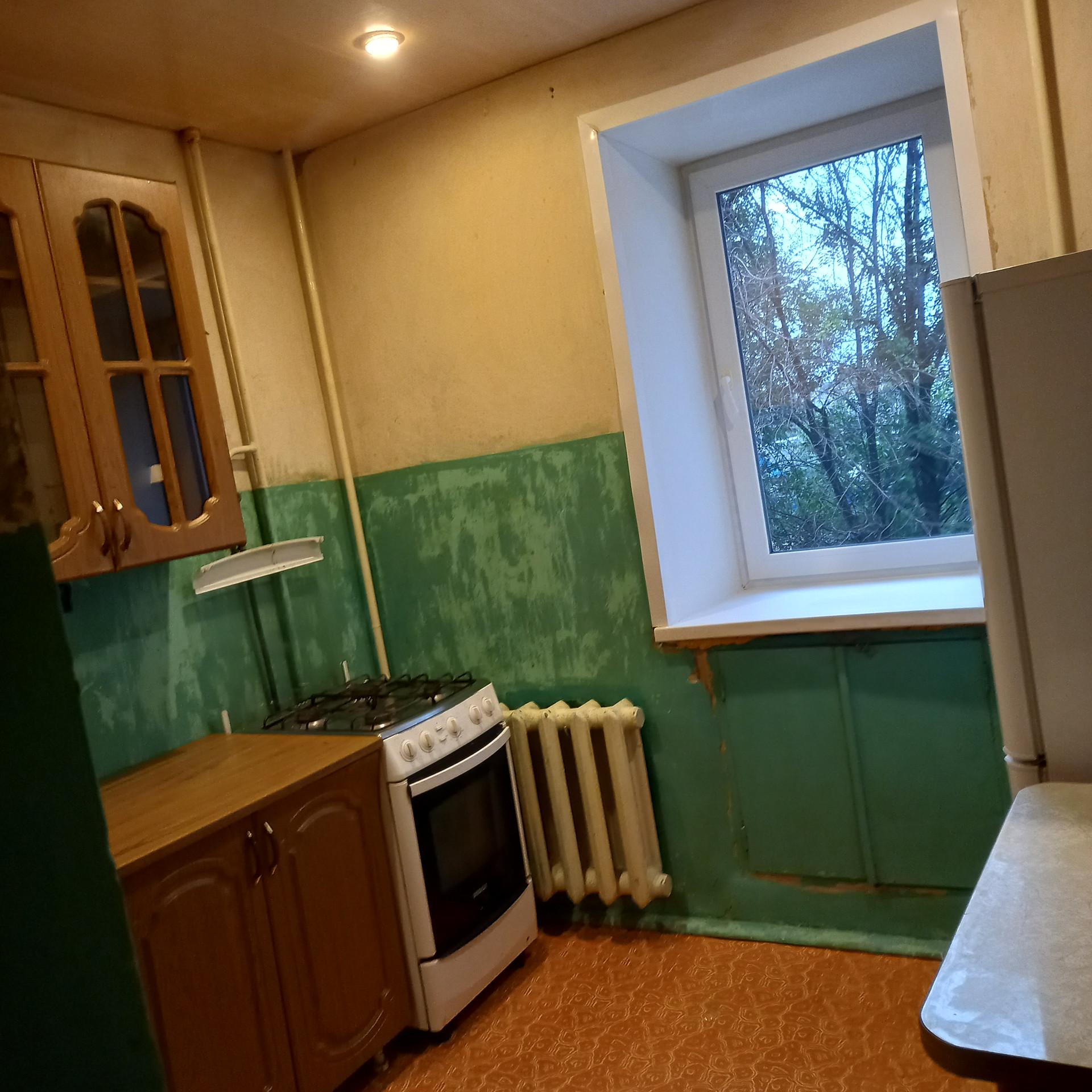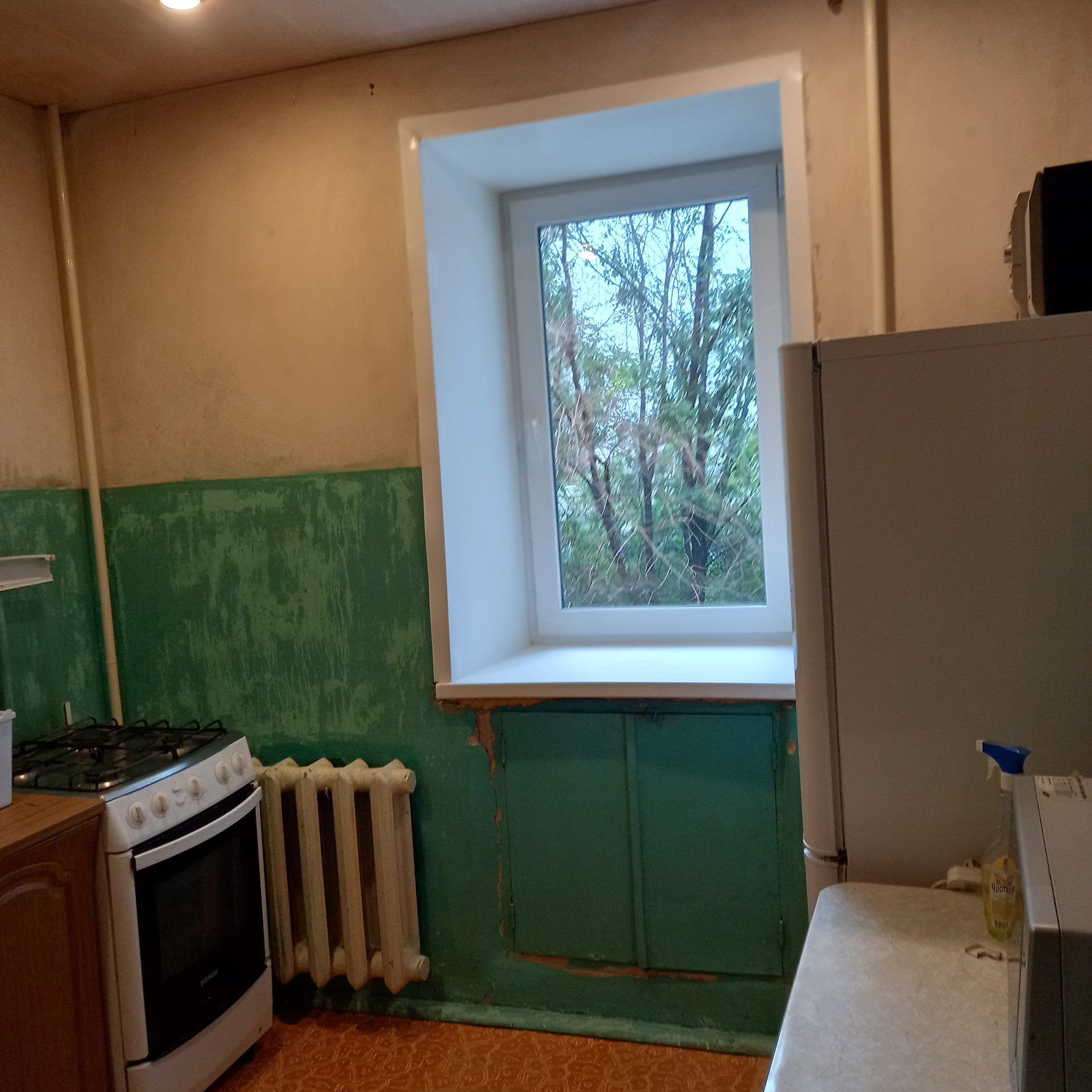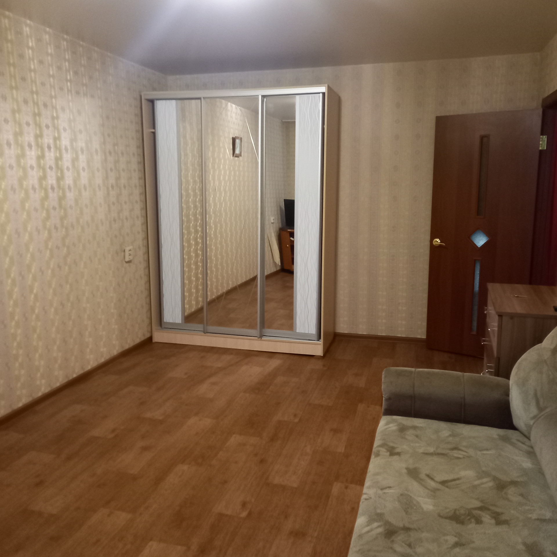 В квартире есть все необходимое: стиральная машина, новый холодильник, плита-BOHS, есть шкаф-купе и большой диван.