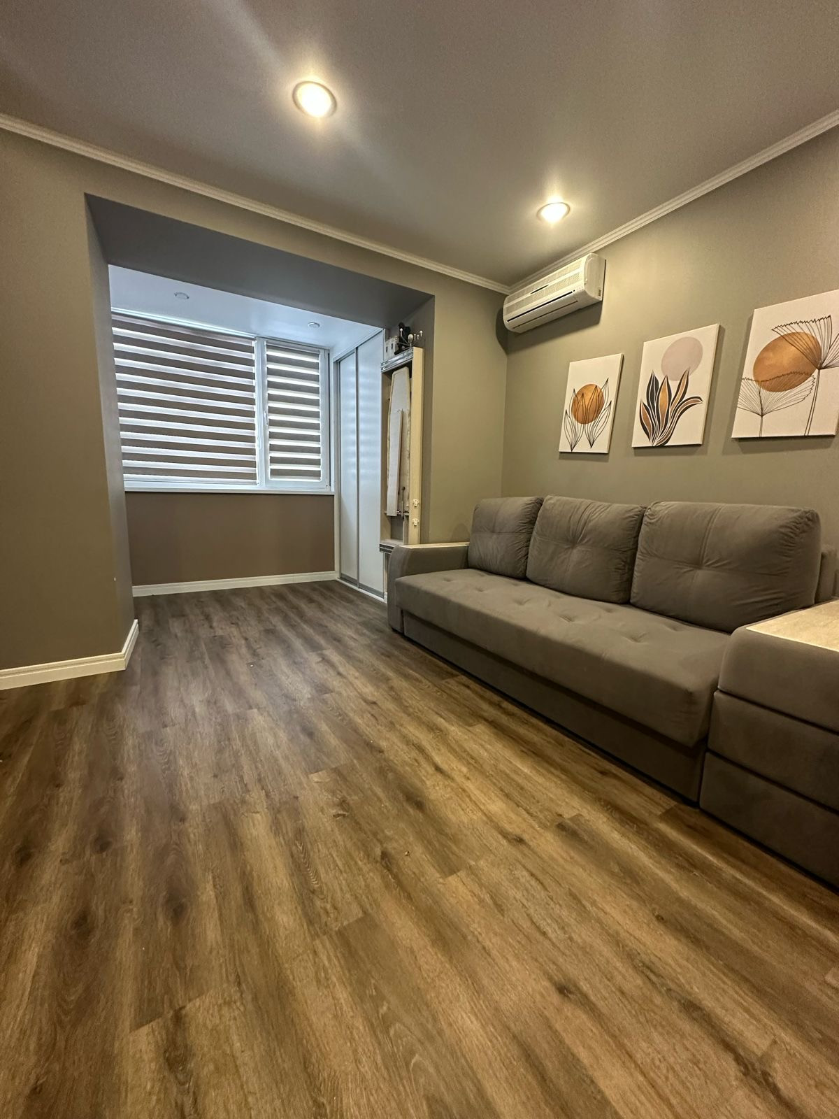Сделан современный ремонт в комнате и в коридоре. Большая лоджия, совмещенная с комнатой. Три встроенных шкафа для хранения вещей. Вся встроенная мебель остается новым владельцам.