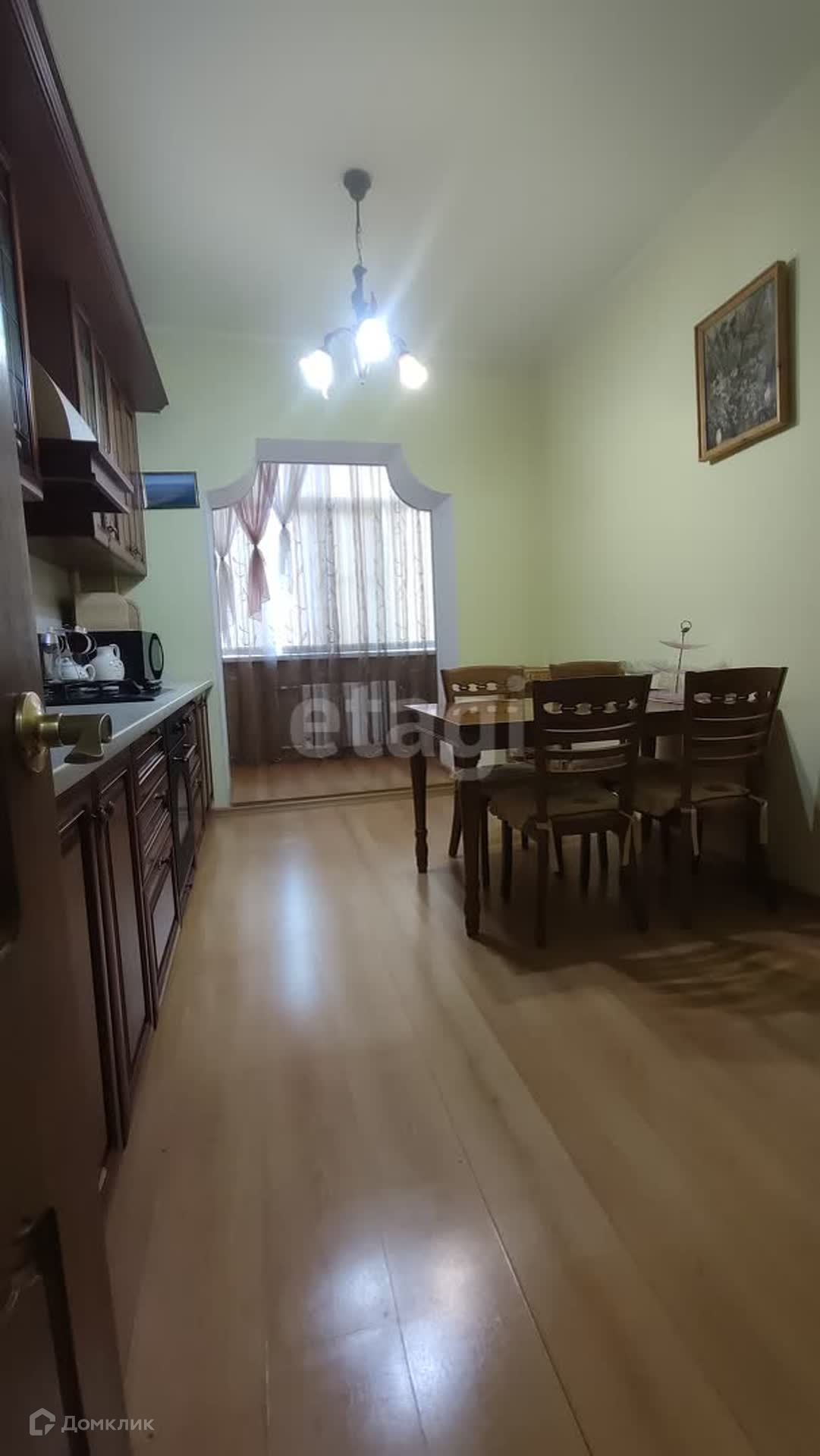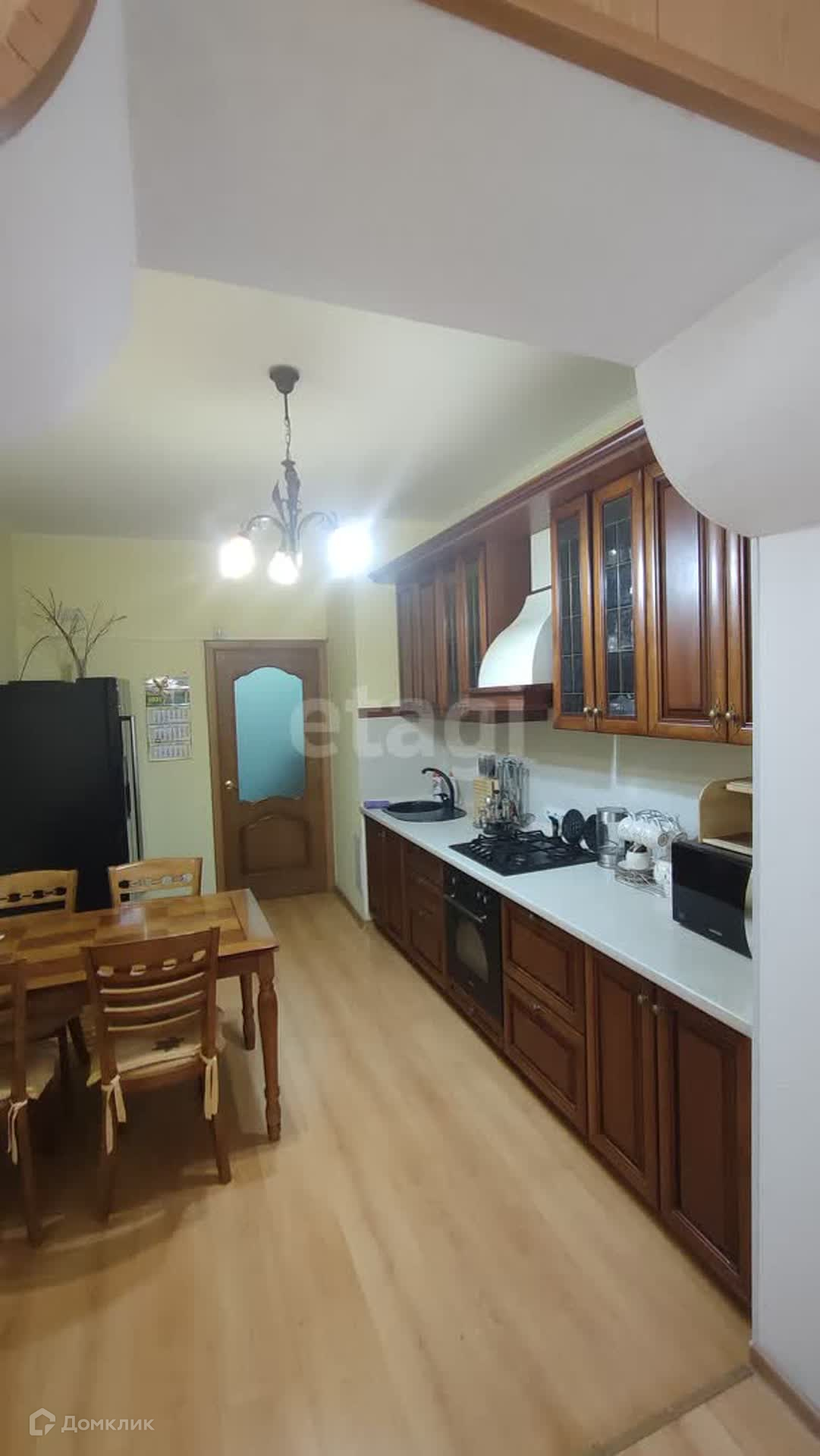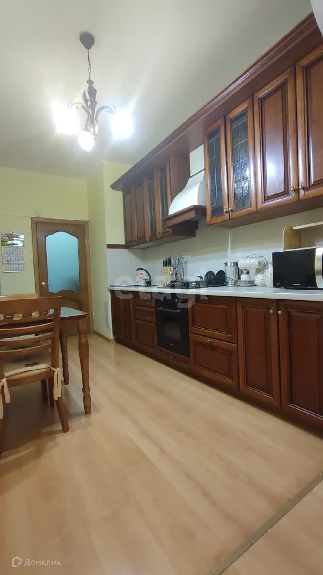 Кухня в классическом стиле, просторная, имеется большой, вместительный холодильник, микроволновка, обеденный стол плюс стулья, духовка отличная для будущей хозяйки! Балкон хорошо утеплен, комфортно и уютно!
