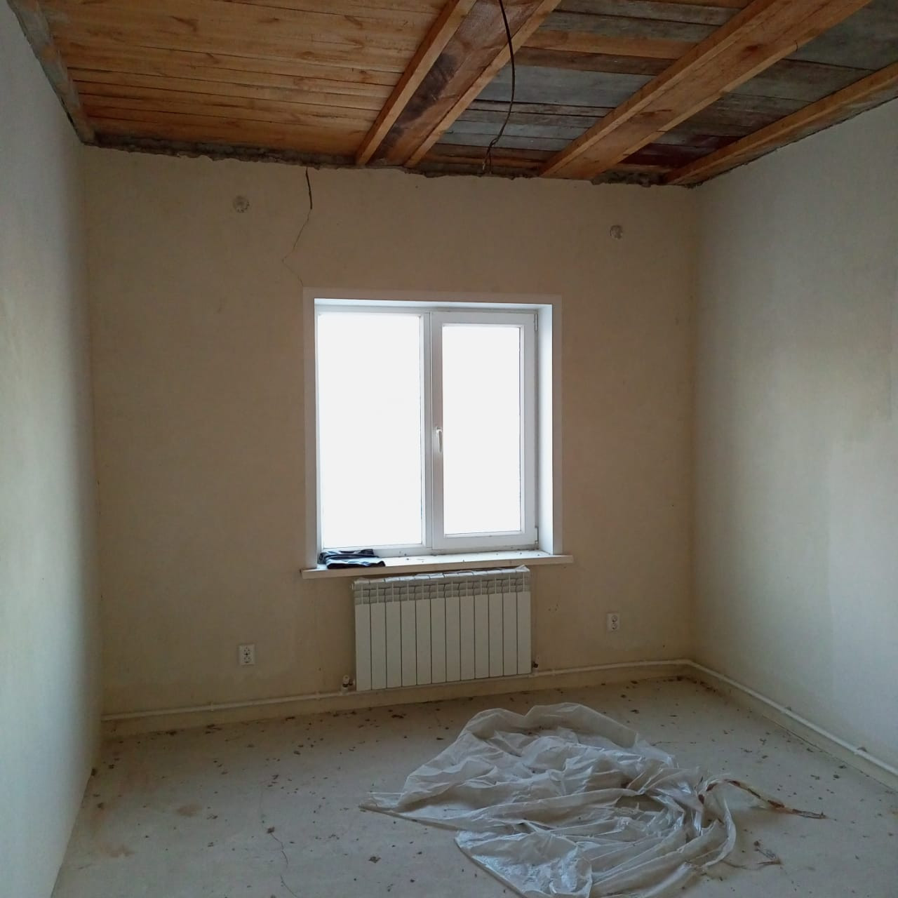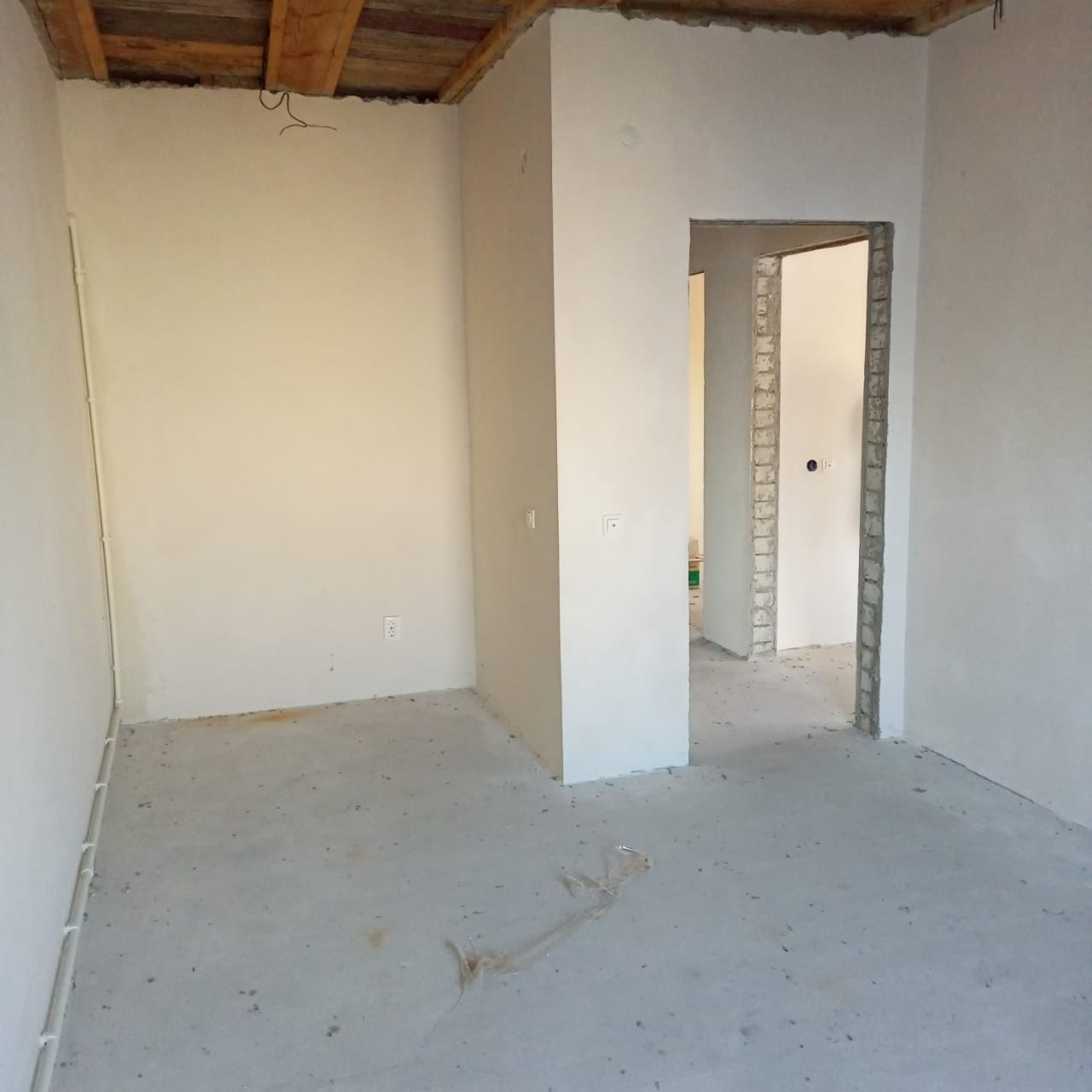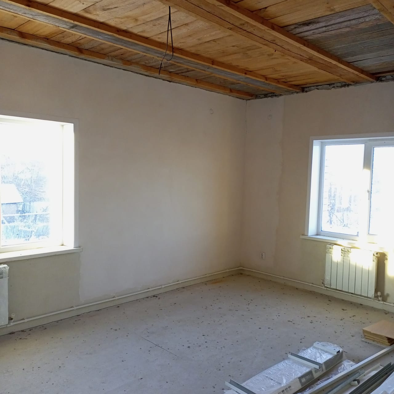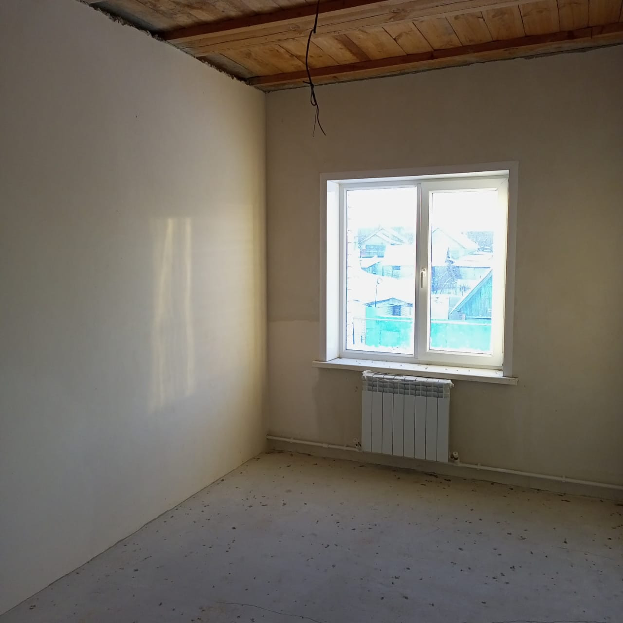 потолок утеплен пенобетоном, стены оштукатурены, пошпаклеваны, на полу имеется стяжка, откосы и подоконники установлены. Туалет облицован плиткой и установлен унитаз.