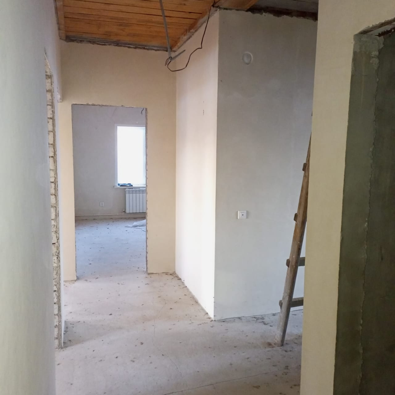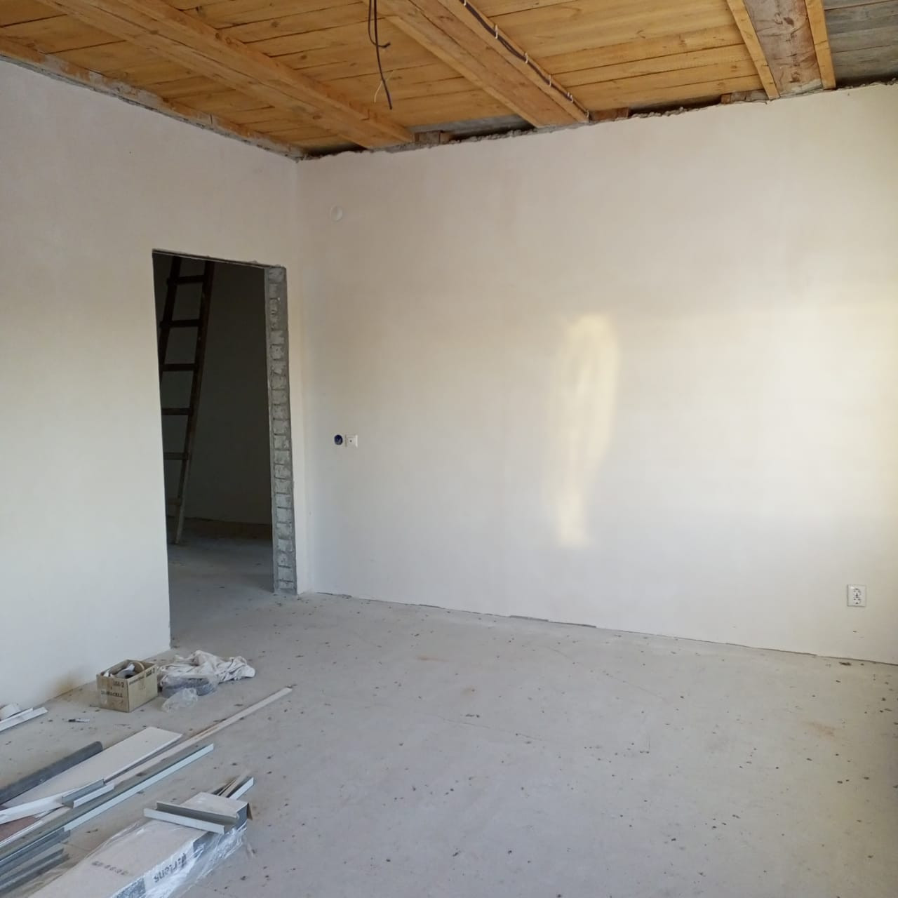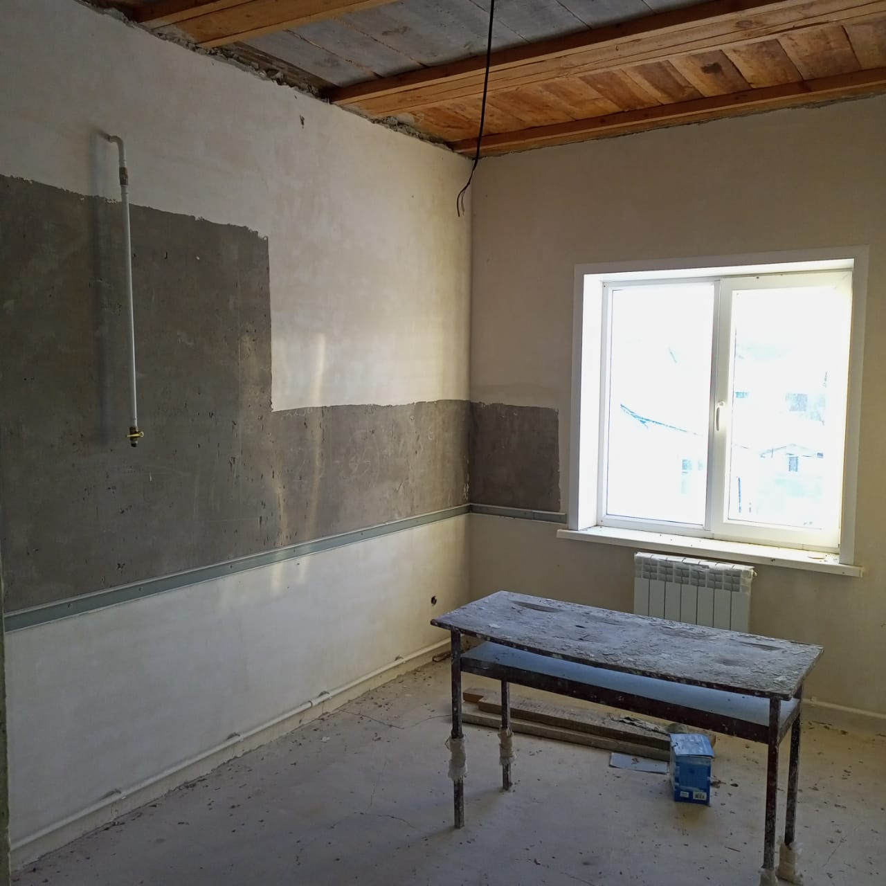 потолок утеплен пенобетоном, стены оштукатурены, пошпаклеваны, на полу имеется стяжка, откосы и подоконники установлены. Туалет облицован плиткой и установлен унитаз.