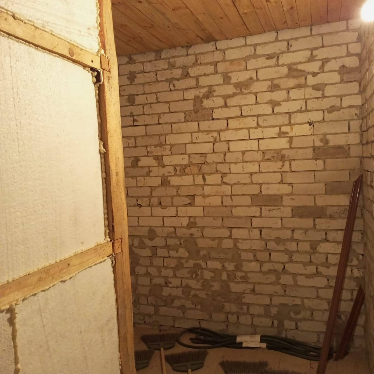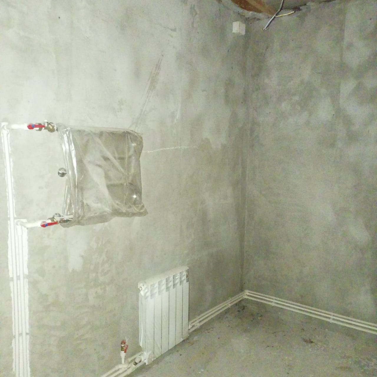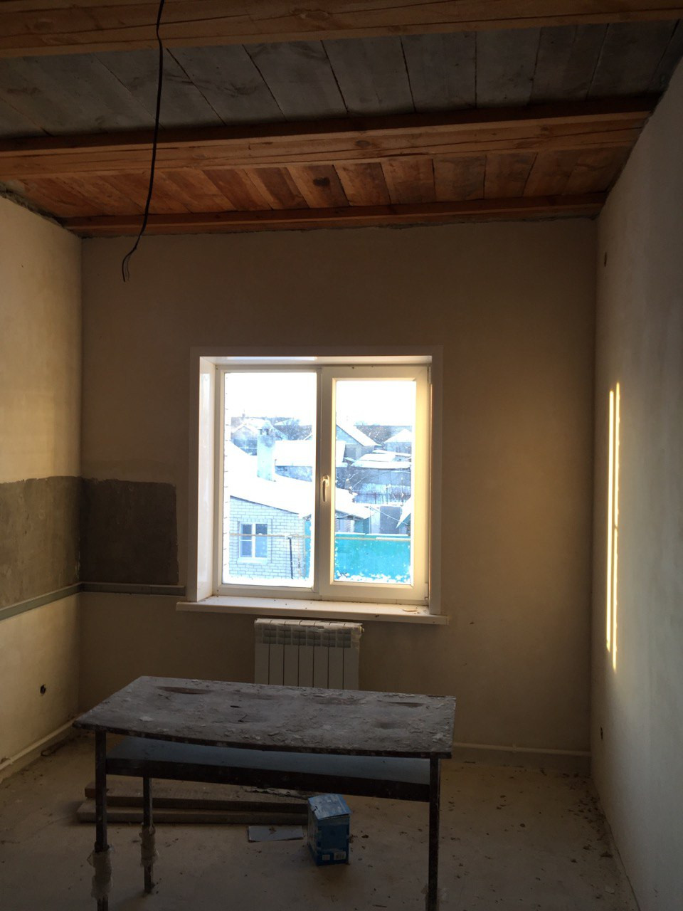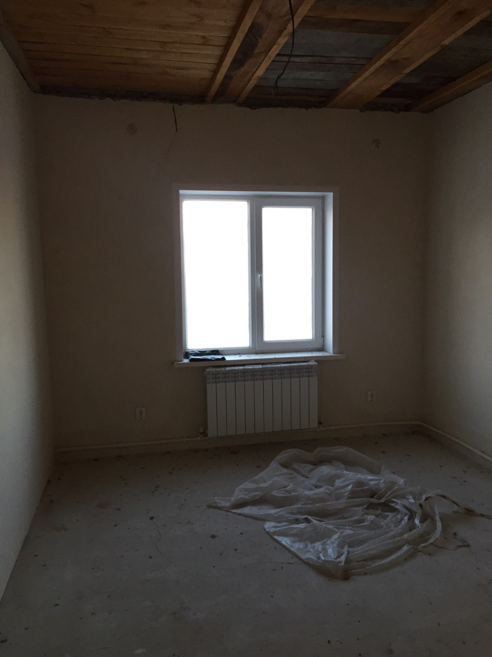 потолок утеплен пенобетоном, стены оштукатурены, пошпаклеваны, на полу имеется стяжка, откосы и подоконники установлены. Туалет облицован плиткой и установлен унитаз.