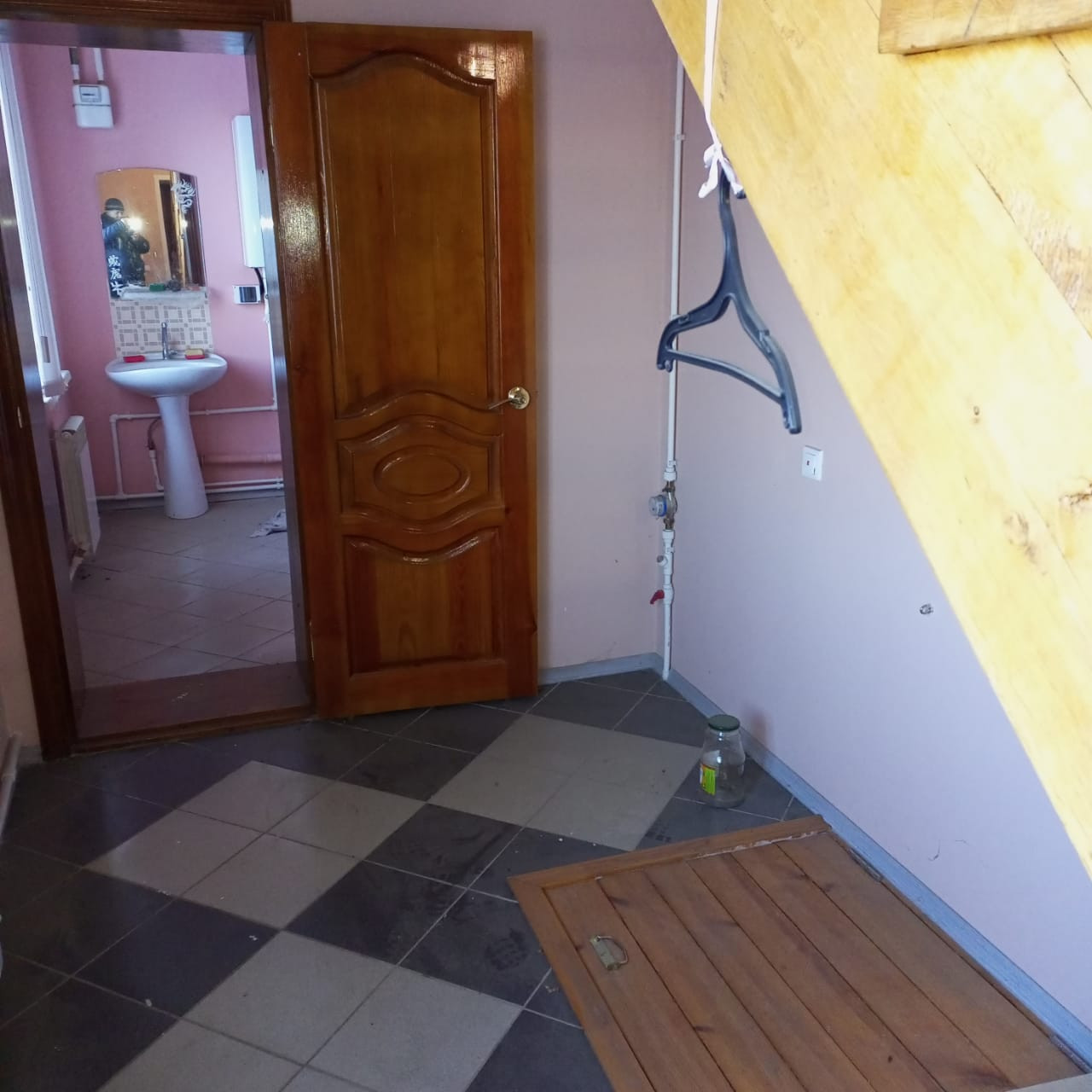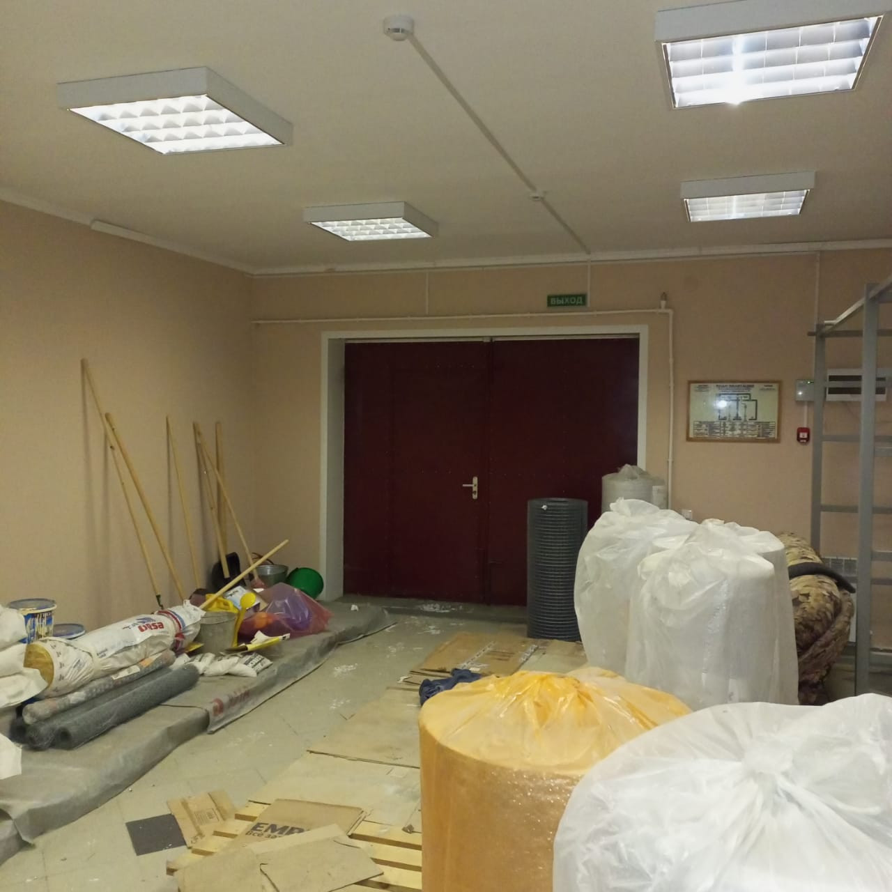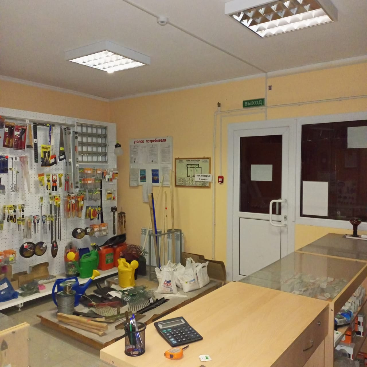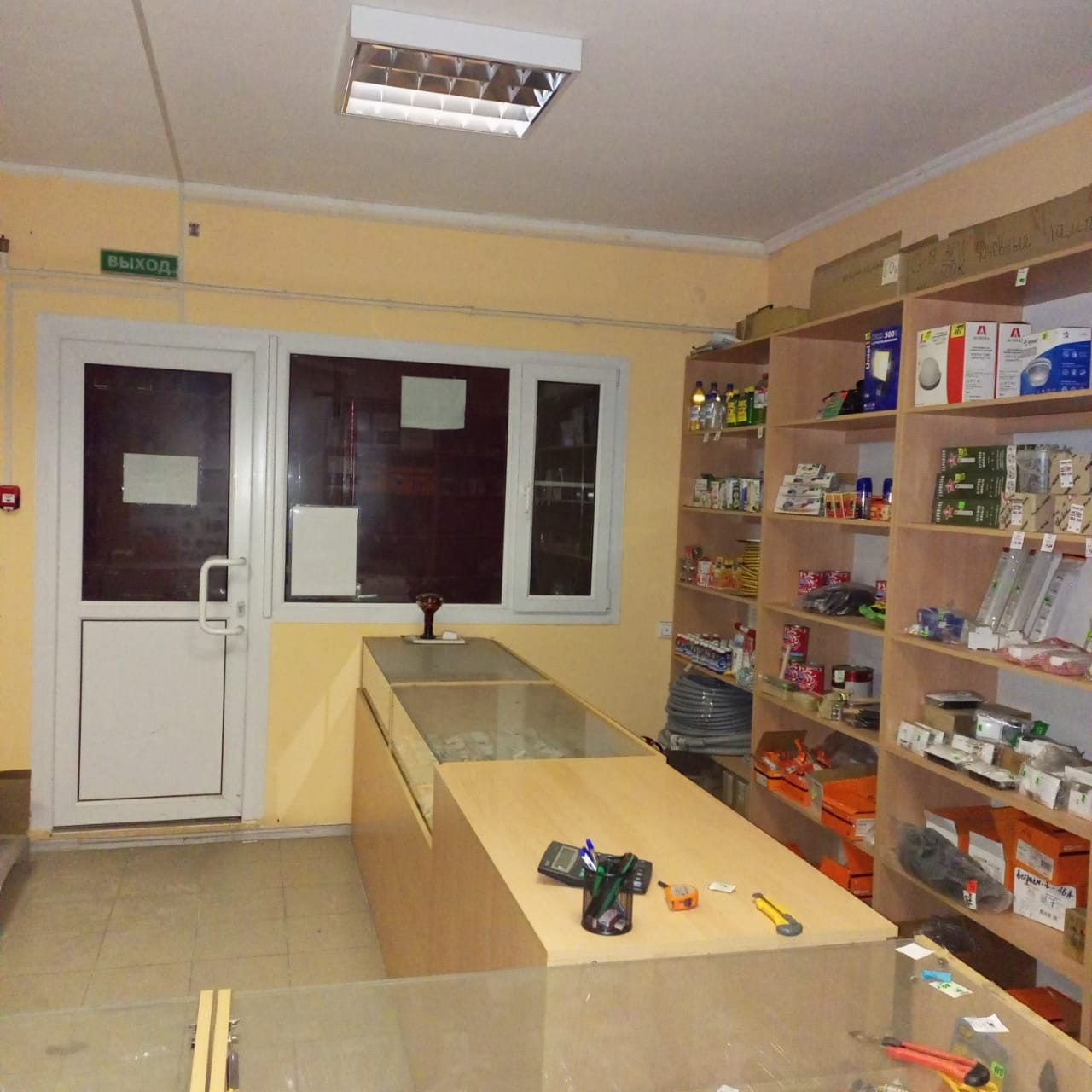 1 этаж – 100 кв.м, 2 торговых зала, котельная и склад. Установлены стеллажи и прилавки с хоз.товарами ( за отдельную плату). На 1 этаже сделан ремонт, стены и потолок – оштукатурены, пошпаклеваны, покрашены, на полу – плитка керамогранит.