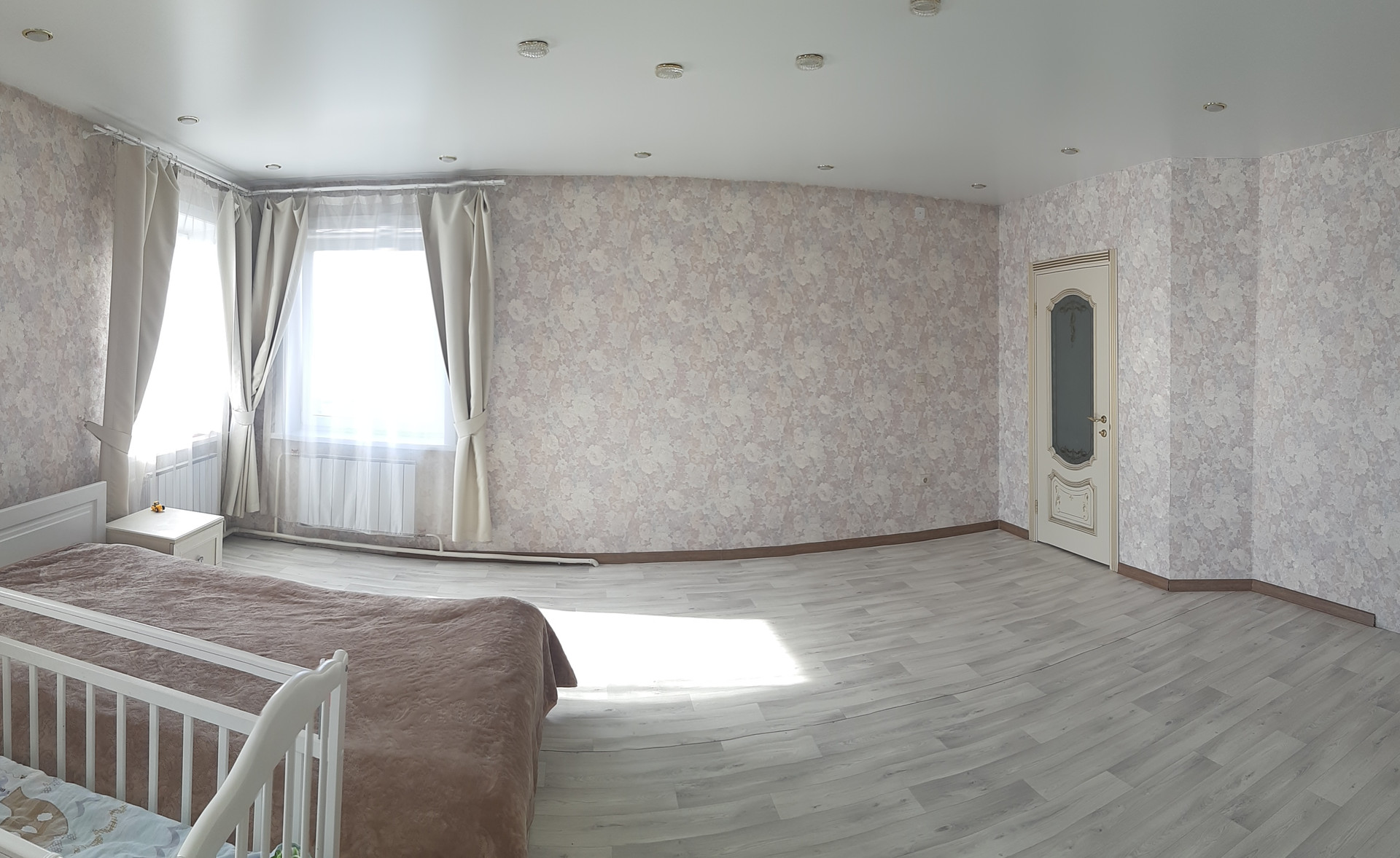 на первом этаже- кухонная и обеденная зоны с эркером, на втором -просторная спальная комната с балконом для родителей, либо можно использовать, как комнату для детей.