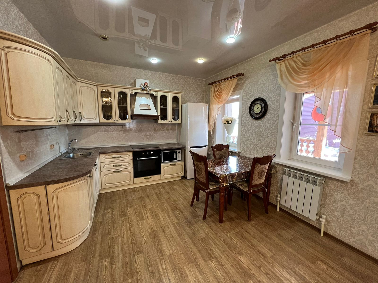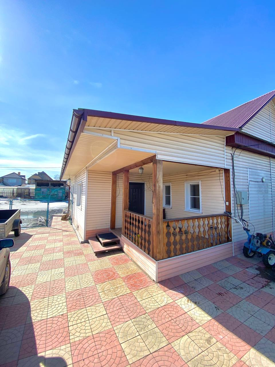 По всему дому натяжные потолки, пластиковые окна. Остается кухонный гарнитур, шкаф-купе. Подполье чистое сухое. Придомовая территория выложена тротуарной плиткой.