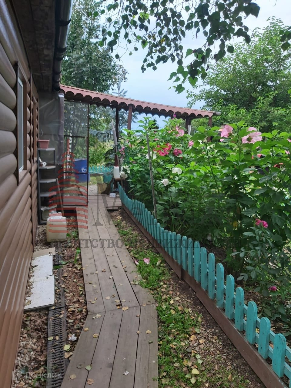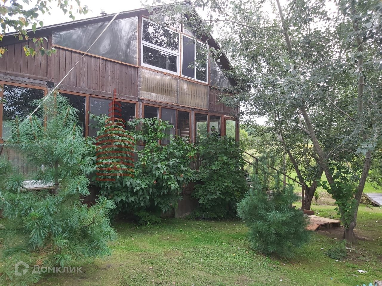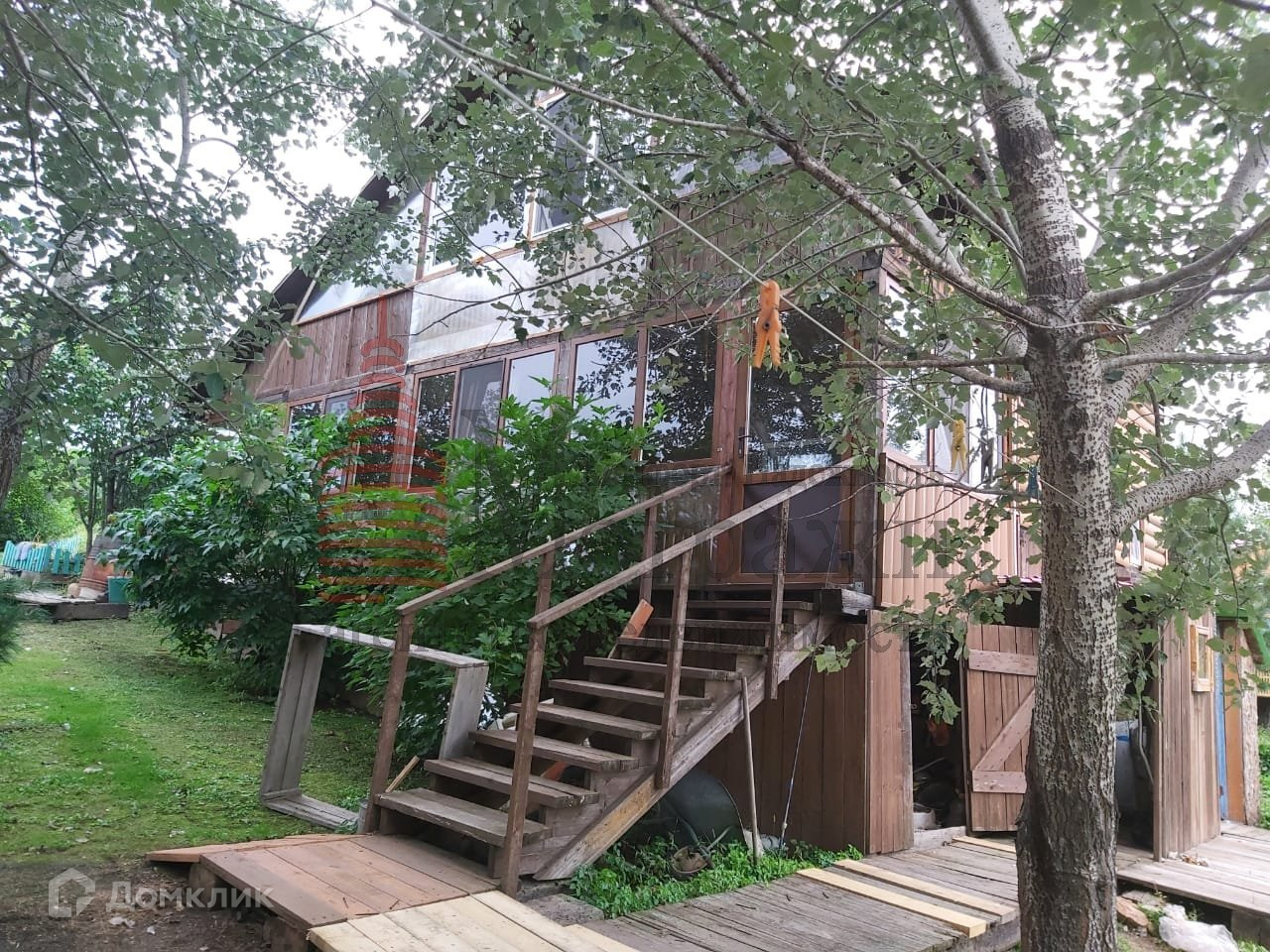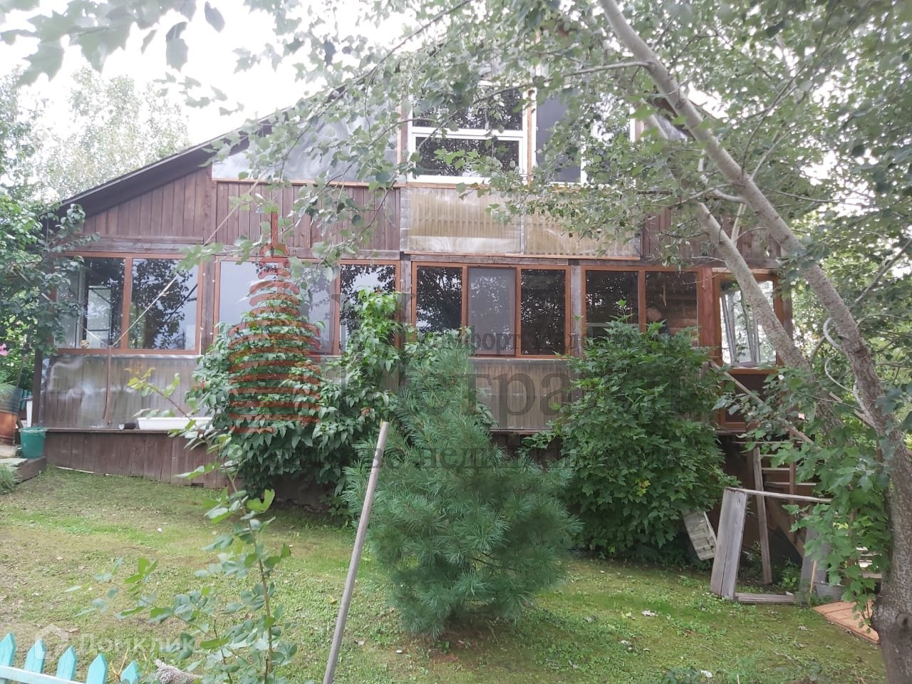 на первом этаже большая застекленная лоджия с двумя входами , к речке  и во двор.