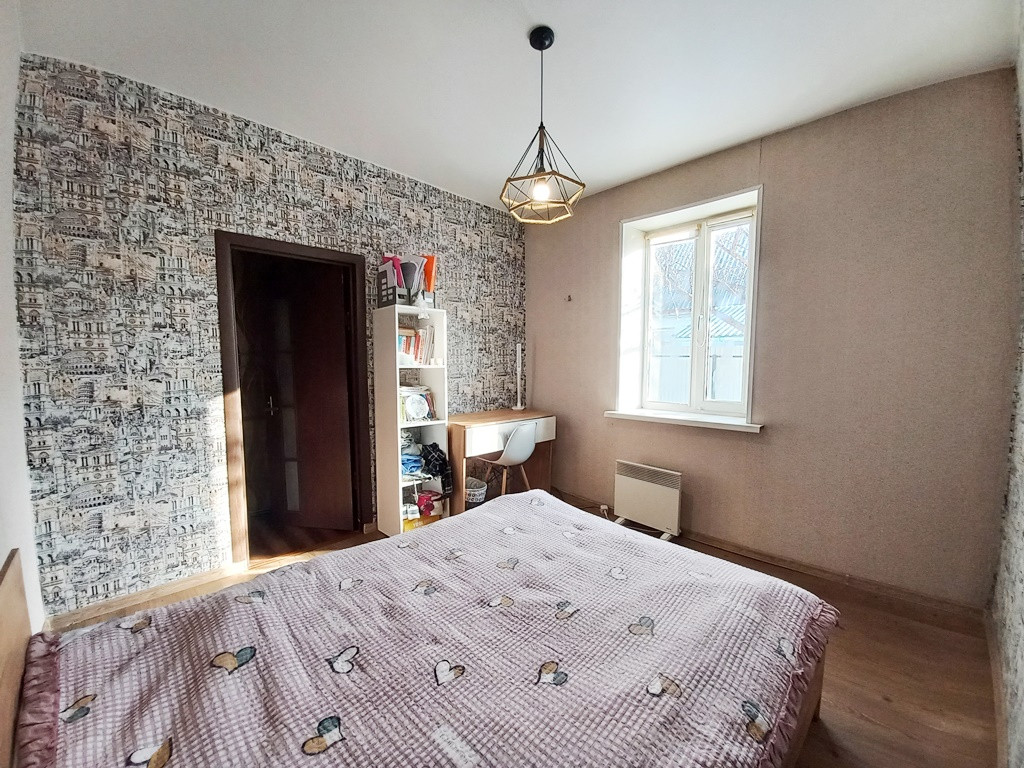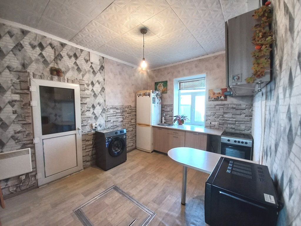 Хорошая планировка дома, очень большая кухня, 3 не проходные комнаты. В доме стены ровные, пластиковые окна, в 1 комнате на полу ламинат, остальные комнаты линолеум. В дом подведена вода (скважина, глубина 7 м, установлена система краб), на кухне на кране установлена система ATMOR, септик объём 5 кубов. Отопление в доме за счет регулируемых конвекторов.