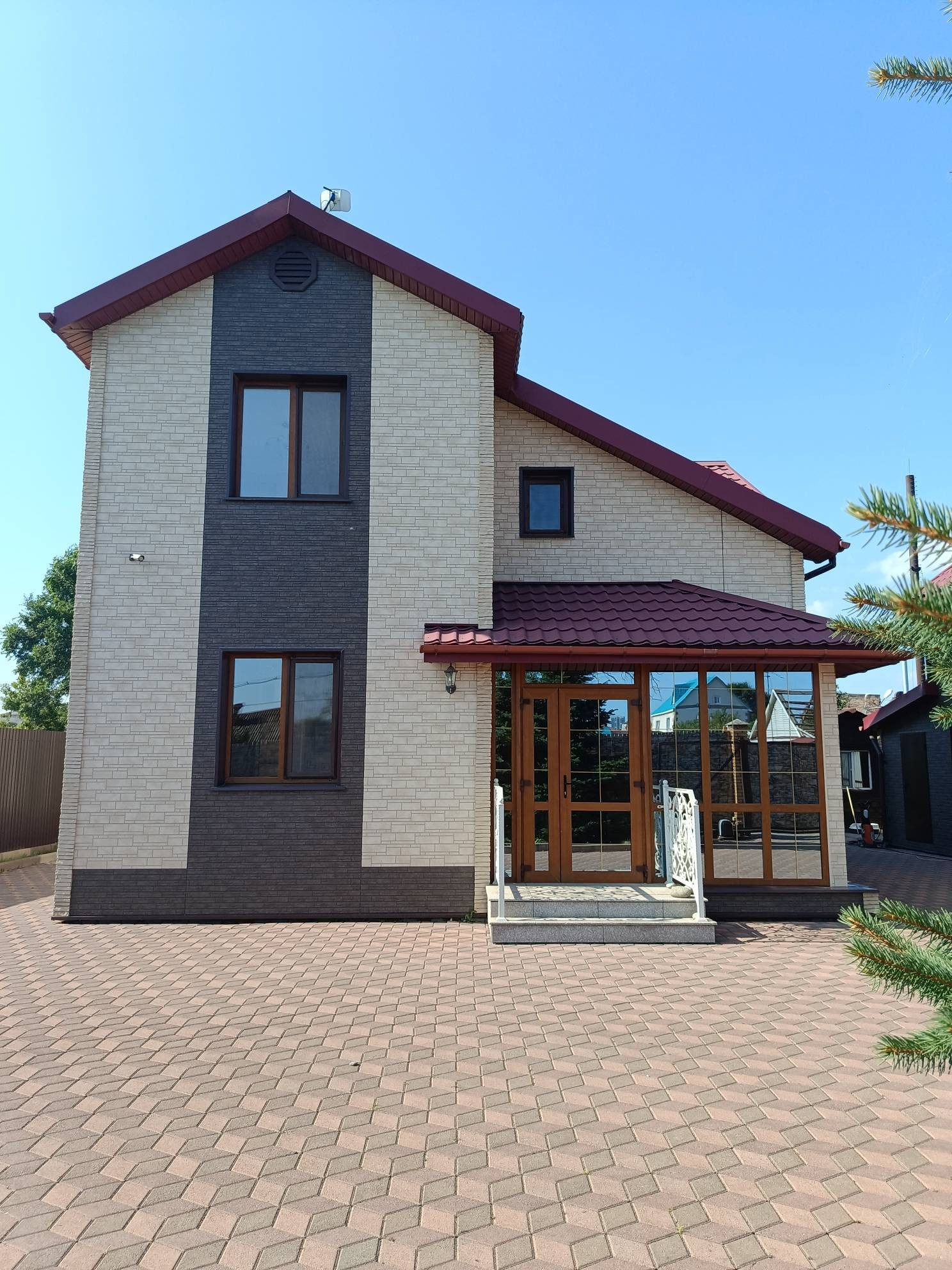 Коттедж 2014 года постройки, построен из бруса лиственницы и кедра, утеплен и обшит фасадными панелями Nichiha, крыша из металлочерепицы.