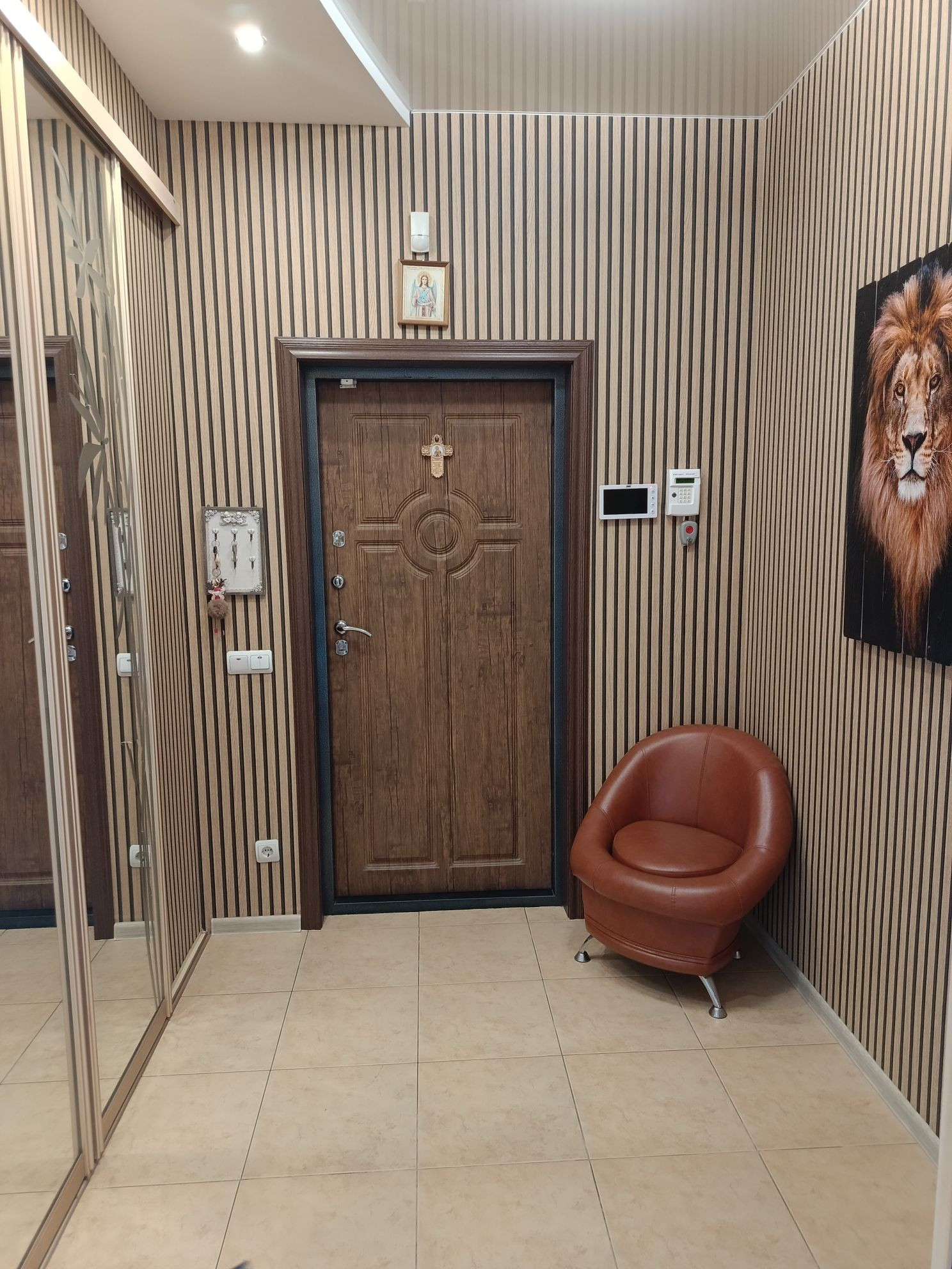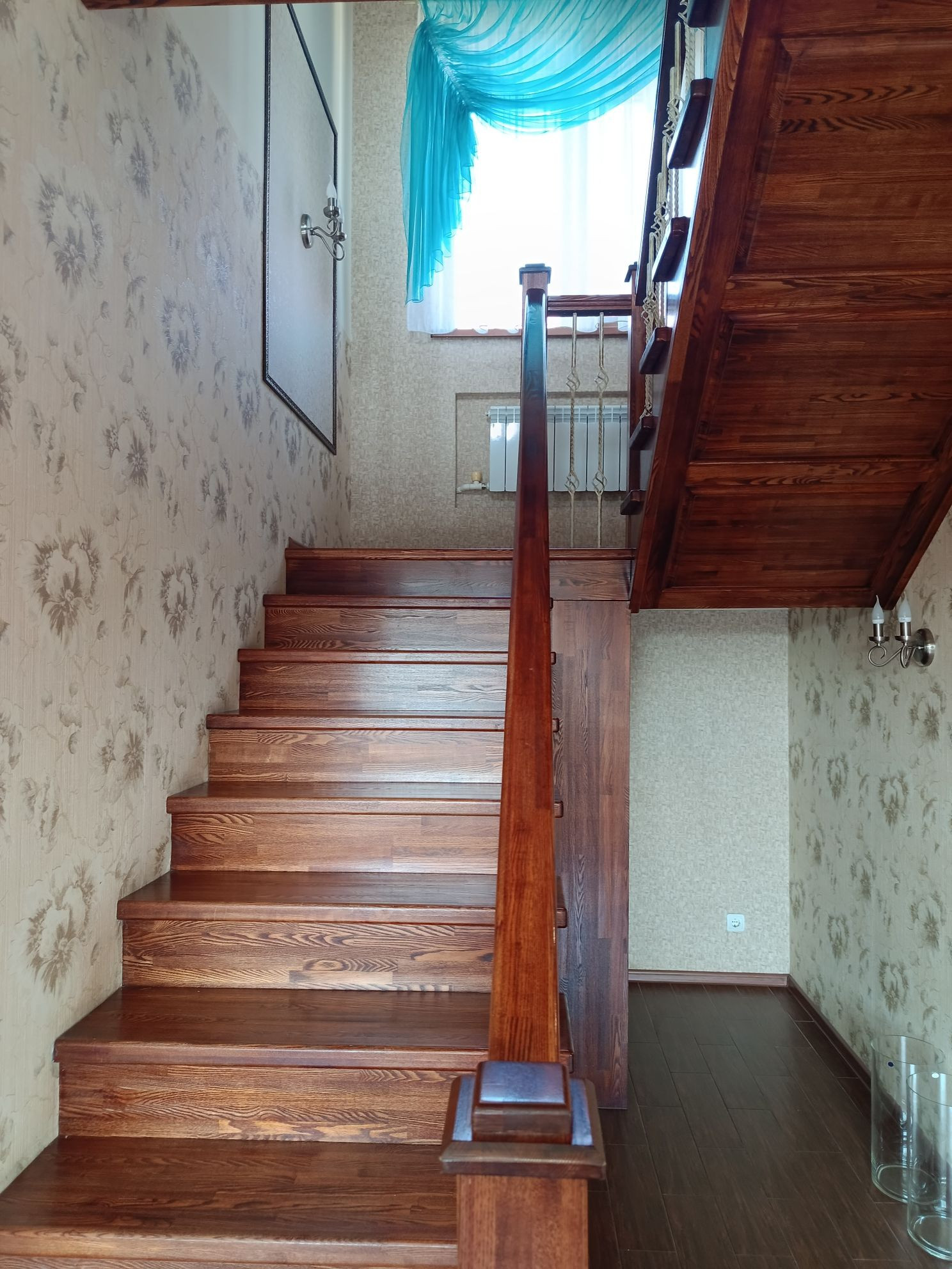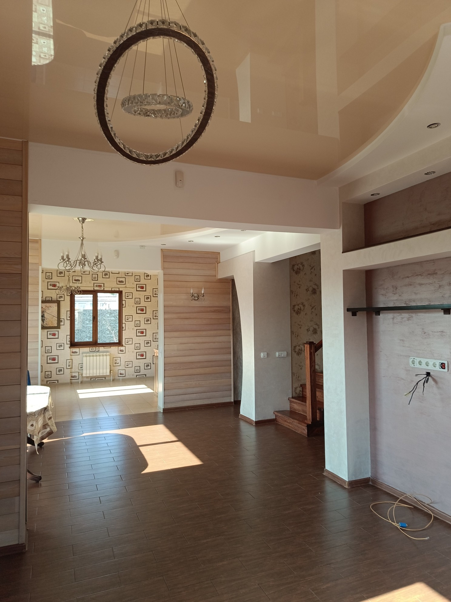 Ремонт в коттедже проводили только качественными материалами- полы-керамогранит(на 1 этаже) и ламинат ( на 2 этаже) , потолки- двух-уровневые, красивые люстры, лестница из массива ясеня, межкомнатные двери из массива, много встроенной мебели.