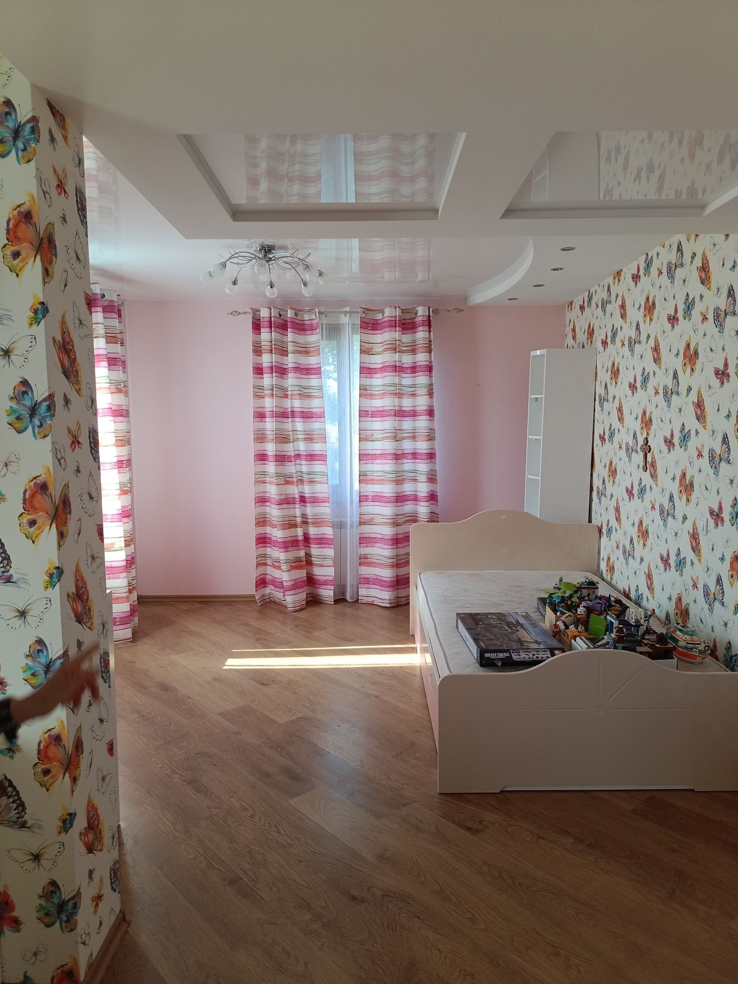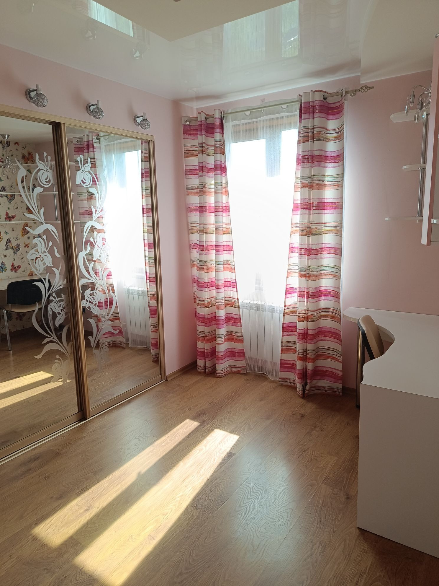 На первом этаже расположены: кухня с отдельным выходом на террассу, столовая, гостинная, постирочная, санузел, гардеробная, на втором этаже расположены: спальная комната и большая детская с гардеробными и сан.узел с душевой.